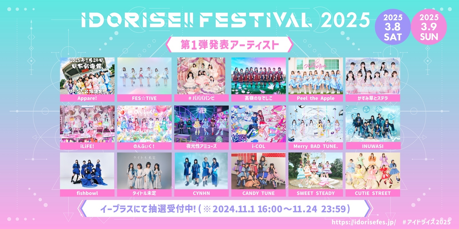 開催発表と合わせ、第1弾出演者として、Appare! / FES☆TIVE / #ババババンビ / 高嶺のなでしこ / Peel the Apple / かすみ草とステラ / iLiFE! / のんふぃく! / 夜光性アミューズ / i-COL / INUWASI / Merry BAD TUNE. / タイトル未定 / fishbowl / CYNHN / CANDY TUNE / SWEET STEADY / CUTIE STREETの18組が発表された。出演者は今後も随時追加される。