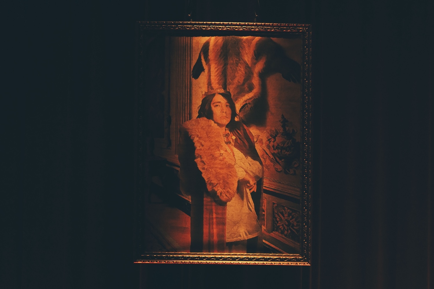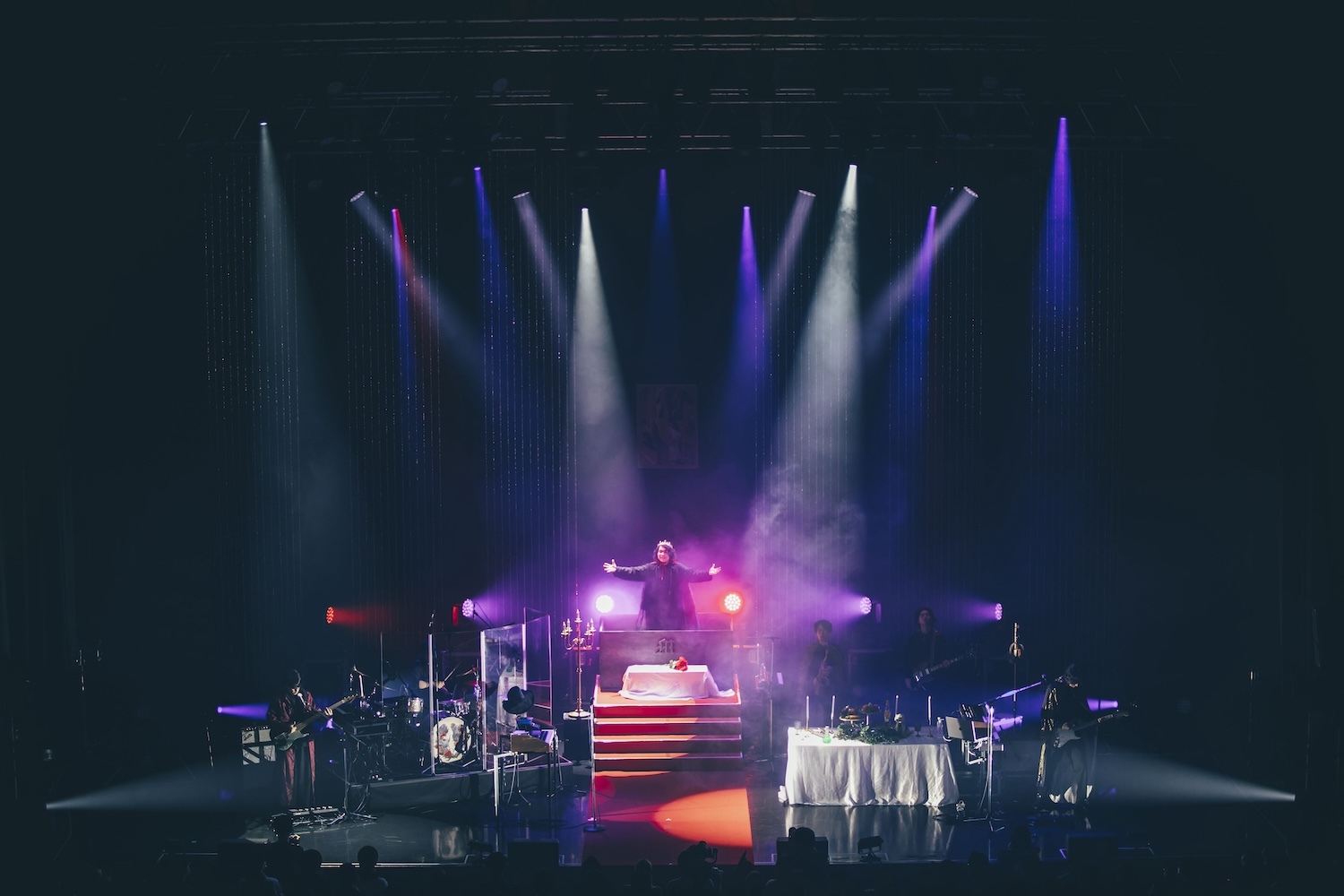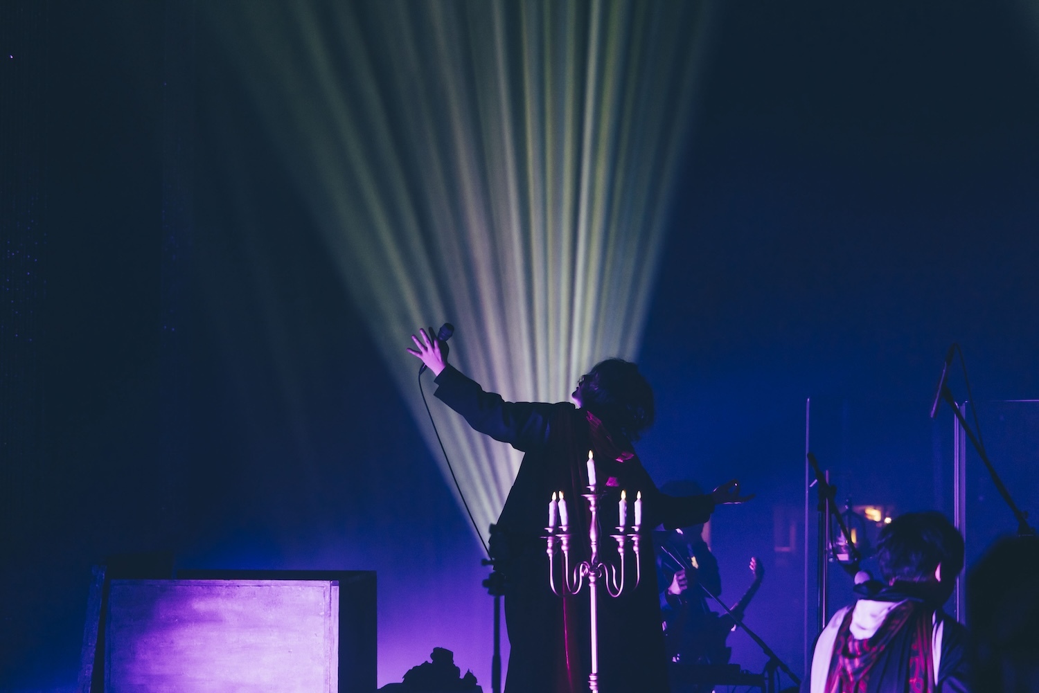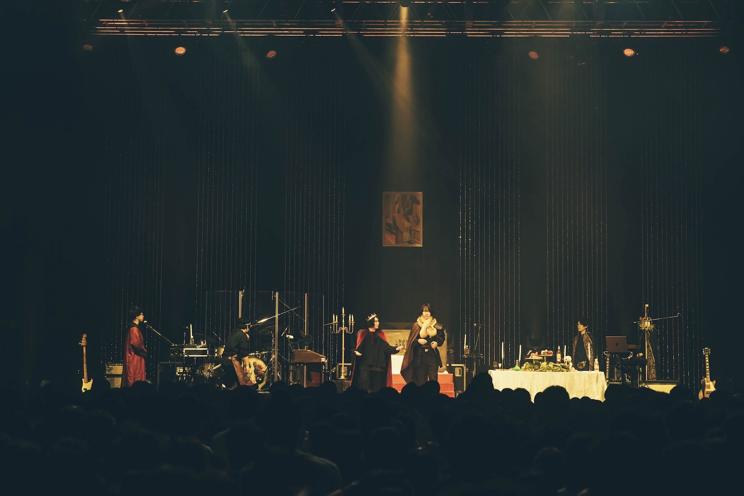 会場に入ると、ステージには王様の玉座、晩餐のテーブルなどが目に飛び込んでくる。そこに子どもの声でナレーションが流れ、どうやらこのシーンは“北海大陸”のM王が巨熊を倒したことを祝う祝宴のようだ。主君“M王”に扮した尾崎雄貴は君主として尊敬されていると同時に、圧政を敷いていることが発言の端々に伺える。「アンコールを忌み嫌う」設定なのも面白い。岩井郁人はM王の片腕である“フミティ将軍”。M王を支えながらも巨熊を倒した手柄を奪われたことなど、諸々の不満を溜めている。そして尾崎和樹はM王の弟、“カズケウス殿下”を演じる。領主でありつつ料理人としての立場に甘んじている。そして岡崎真輝が演じるのはM王に一目置かれる“オチャ大臣”。禁忌の魔術を使え、怪しい薬をM王に勧めたり、妹オフィーリアをM王に近づけたりM王の権力を狙う存在だ。この役柄の設定、ストーリーは雄貴の手によるもので、それぞれ腹に一物抱えた生臭い人間像だったり、関係性は今のGalileo Galileiだからこそ描けるのだろうし、雄貴の楽曲での作風にも通じるところを大いに感じた。