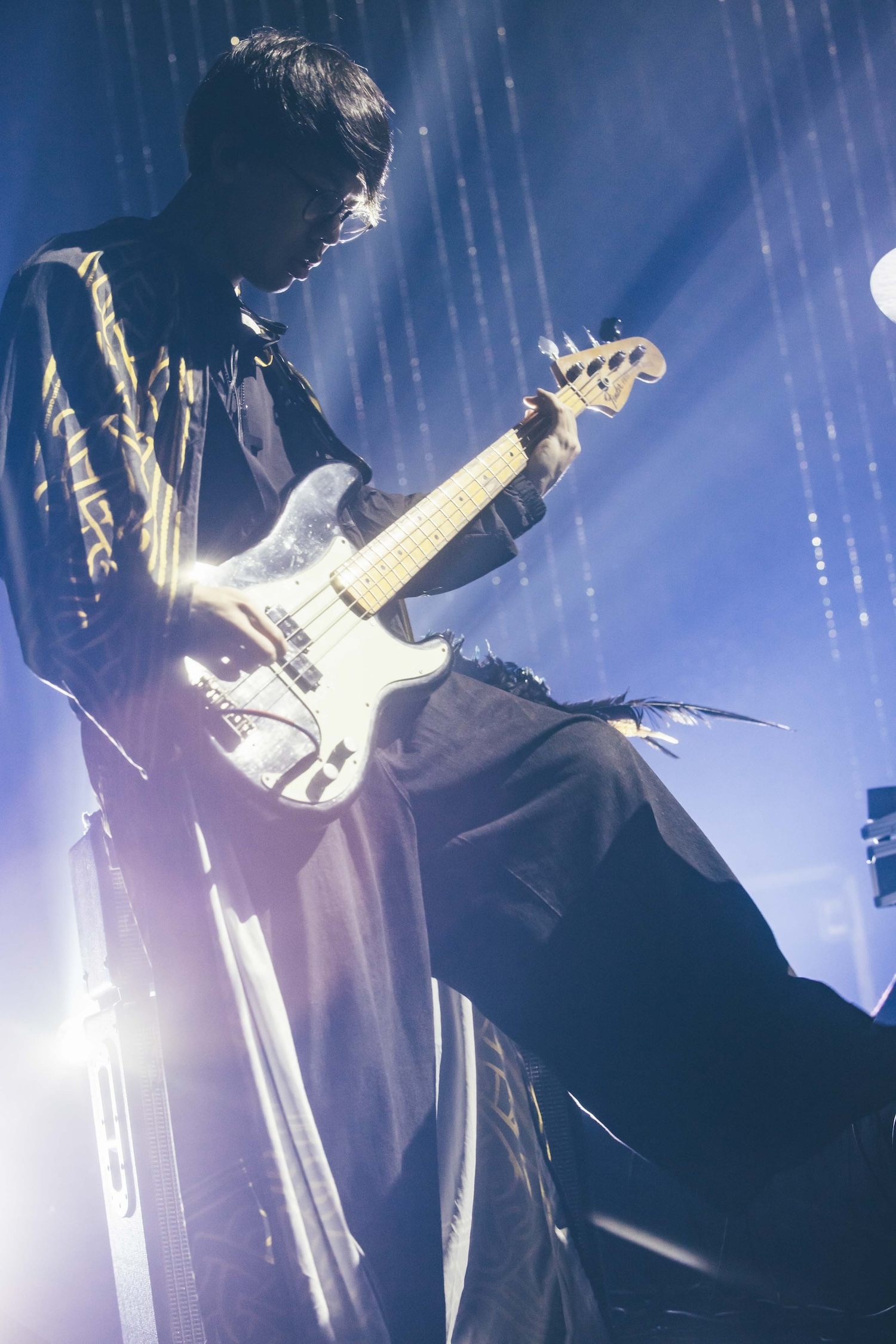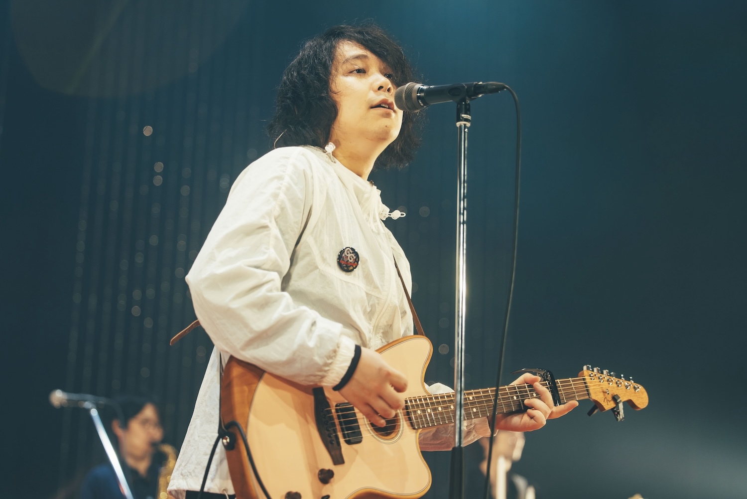 岩井のリリカルなフレージングで始まった「カルテ」は雄貴の子ども時代の記憶をベースにしているものの、ロックオペラのような壮大さを醸し出し、ブルージーな主題とドリーミーなサウンドの甘美さが相まって、劇の設定も今ここがどこなのかも忘れてしまう。架空の子供時代へのマインドトリップ。それは雄貴が丁寧にメロディを歌い、過去のどこかの場所に誘われる「カラスの歌」でさらに想像の純度を高める。この曲の核心と思われる“大人にも子供にも、最期は見えてしまうものだな”というフレーズに生命の営みを感じ、胸がいっぱいになってしまった。さらに大久保のサックスのロングトーンが加えられた「UFO」のイントロに楽曲へのリスペクトと献身を感じ、途轍もない地平で彼らの音楽が鳴っていることに身慄いした。そして子供時代の夢みたいな記憶は続く「ギターバッグ」で、コイツとバンドがやりたいんだという理屈抜きの欲望の物語に自然に繋がっていった、と思う。こうして一度“死んだ”バンドはまた始まるんだな、とワクワクする気持ちが湧き起こると同時に、この曲は前作に収録されてはいるものの、『MANRAL』を象徴する気分も担っているように響いた。ここで楽団Galileo Galileiによる1部の演奏が終わった。