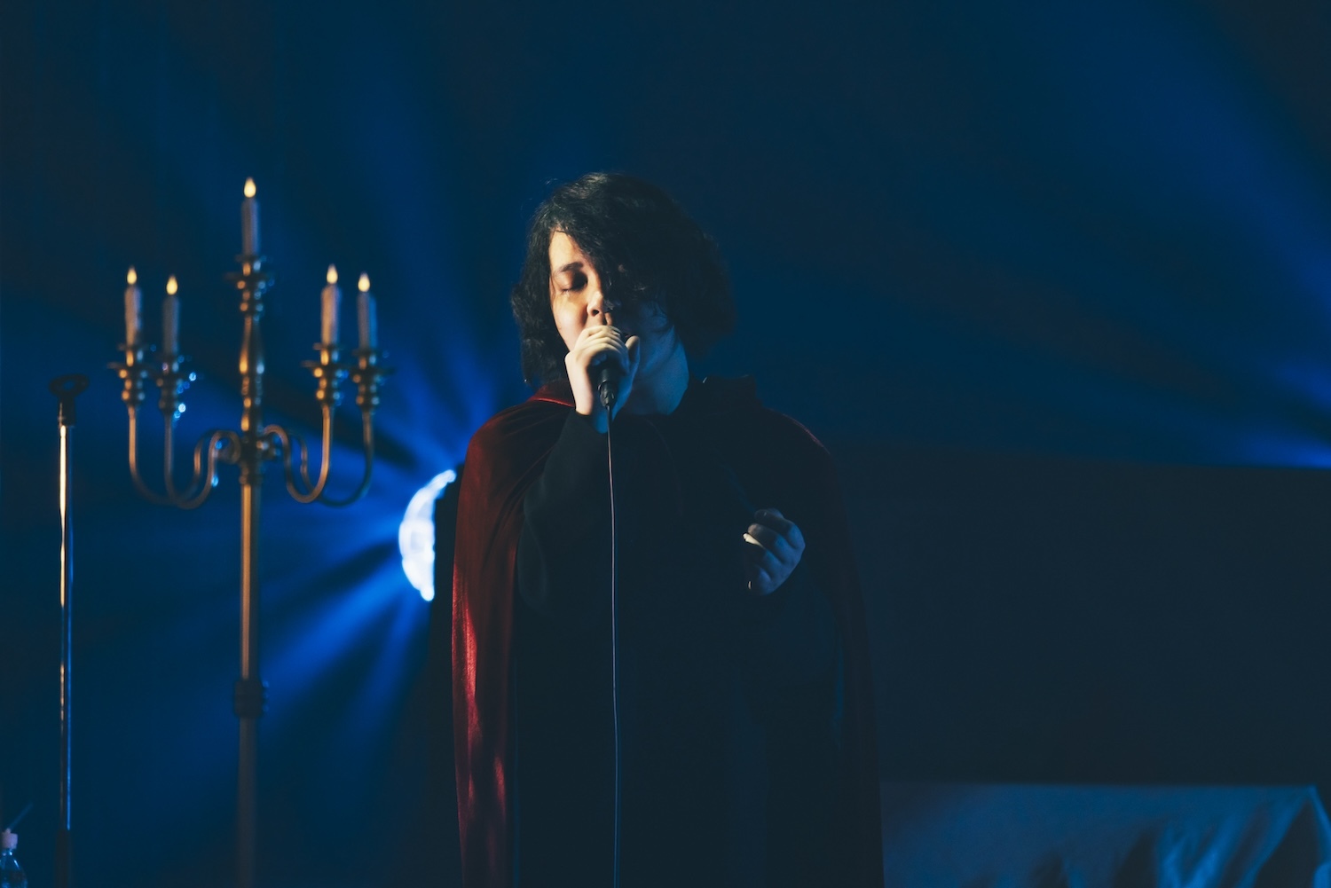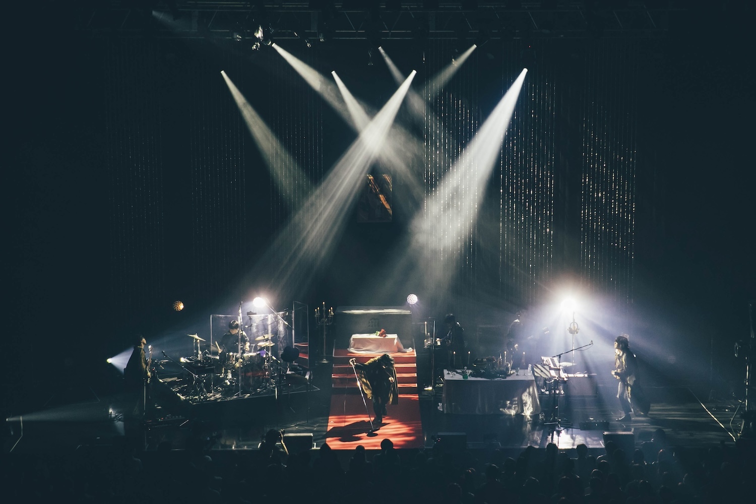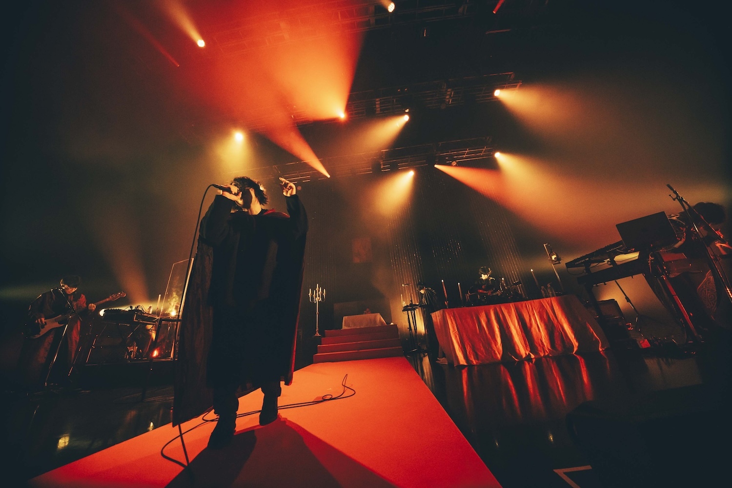 2部はオチャ大臣がM王を蘇らせるかのような地響きを伴うラウドなベースから幕を開けると、階段の上部に安置されていたM王の棺の蓋がバタバタ揺れ始め、死んだはずのM王が復活。そのままタフな「MANSTER」の演奏に繋がっていった。今度は異邦の楽団Galileo Galileiではなく、役柄のまま演奏するという設定だ。アルバム『MANSTER』が社会的な顔や外面に寄った精神状態をテーマにしているだけになんとなく納得できる上、勇ましい戦士たちの楽団と捉えると、ハードなサウンドがしっくりくる気もする。特にそのヘヴィネスを柔軟な演奏で支えた岡崎の存在感の急進が目を引いたが、オチャ大臣の演奏から始まったことの意味もしっくりきた。1曲終えるとM王に扮した雄貴は自身にふりかかった暗殺〜復活を「何が起こったのかわからないが、パワーが漲っている。今ならなんでもできる気がする」と豪語した。続く「CHILD LOCK」はDAIKIのハードなリフが冴え、拡声器のようなエフェクトのかかった雄貴のボーカルが危機的な状況をイメージさせる。車に閉じ込められた子供の立場と年齢を問わない視点は先ほどまで棺に閉じ超えられていたM王と重ならなくもない。そして、フロアも過去最強のラウドかつヘヴィなサウンドに煽られ熱を増す。