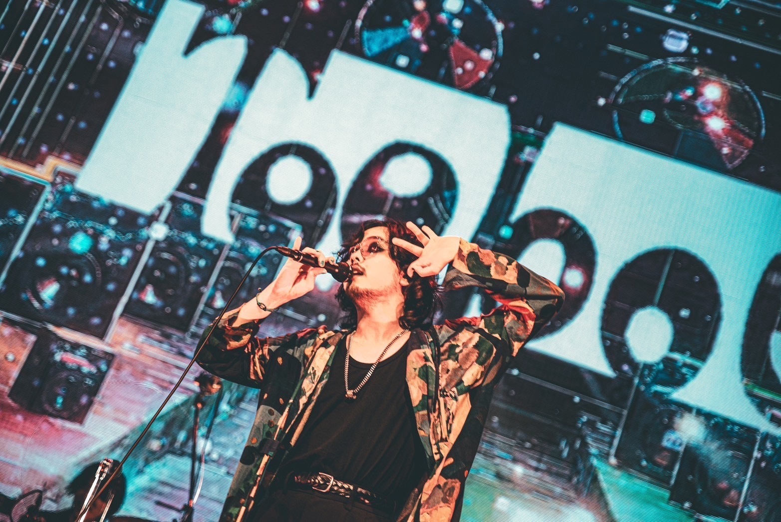 「お疲れ様です」といつもの挨拶をすると、今回FAKE TYPE.を誘った経緯を話すTOOBOE。今年の『JAPAN JAM』が直接のきっかけだが、もちろんそれ以前も知っていたし、「ウタカタララバイ」は好きな曲だし、作家としても近い界隈なことも起因しているのだと。「(ラップで)よく噛まないなと思うし、ああいうライミングする人いないからすげえなと思う」と絶賛した。「俺らも負けないように」と意思統一しているムードが非常にバンド的だ。序盤に受けたファンクサウンドのアンサンブルはPUFFYとコラボした新曲「コラージュ」やソロ回しで盛り上げた「爆弾」でもさらに続く。ソロ回しの際にメンバーの画像が大写しになるのも、このメンバーで高まるバイブス、オーディエンスからの認知も相まって効果的だった。特に飯田の自由な発言はもはやTOOBOEライブの特徴ですらある。