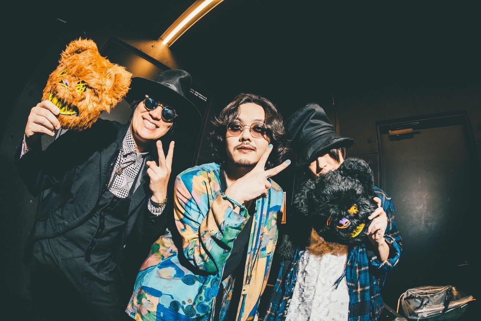 先攻のFAKE TYPE.がギタリストとVJを引き連れ、本人たちは“偽型”と書かれた番傘に隠れ、獣の面で顔を隠してステージに登場すると、彼らのワンマンか?と疑うほどの大歓声。第一音からFAKE TYPE.のエレクトロスウィングを象徴するピアノリフが転がり、「真FAKE STYLE」でスタート。のっけからトップハムハット狂の高速ラップに開いた口が塞がらないまま、続く「魔崇拝麗奴」を走り抜けた。カラフルなグラフィックやアニメーションを駆使したVJと、それを操るメンバーも共に盛り上げるスタイルが楽しい。生ギターが入っていることが大いにフックになっているのはもちろん、「FAKE SOUL」ではDYES IWASAKIがサックスを演奏したり、音源では花譜がフィーチャーされている、ラグタイムをポップにアレンジした「マンネリウィークエンド」など、エレクトロスウィングを軸にしつつ、多彩なライブアレンジと曲調で飽きさせない。しかも投影されるリリックの日常を描く腹落ち感とラップの速度両方に“・・・”な感想を持つほかなくなってしまうのだ。