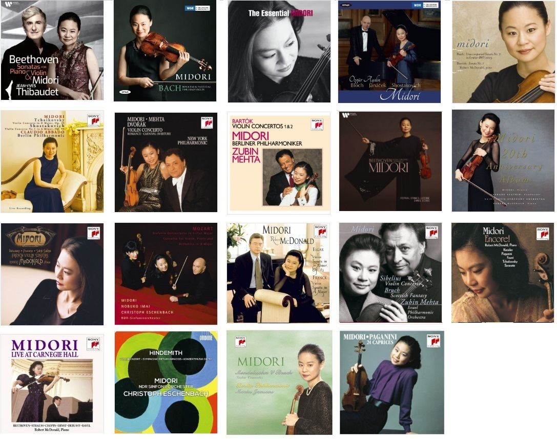 一段目左から ①ベートーヴェン ピアノとヴァイオリンのためのソナタ 5,000円 ②J.S.バッハ 無伴奏ヴァイオリンのためのソナタとパルティータ 4,500円 ③ベスト・オブ・五嶋みどり(2枚組) 4,000円 ④20世紀のヴァイオリン・ソナタ集 3,000円 ⑤バッハ&バルトーク 3,000円