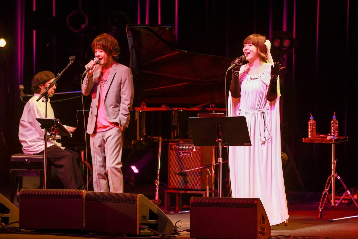 「Singin’ In The Rain」を陽気でリズミカルな演奏で届けた後は、こちらの身体に直接作用してくるご機嫌なシャッフル感と、間断なく速弾きを続けるピアノ演奏にも沸いた「Just One Of Those Things」とジャズナンバーを連打。そして「この方は本当に長い友達ですね」と前置いてから、同じ小学校に通っていて共に絵画クラブに所属していたものの、向こうはそのことを全く覚えていなかったというエピソードのおまけ付きで、「Cheek To Cheek」のイントロに乗り登場したのはTRICERATOPSの和田唱。笑顔でハイタッチを交わしてからのハモリながらのデュエットはとてもスタイリッシュで洒落ている。少し鼻にかかった和田の歌声とジャジーな演奏との相性も予想以上に良い。