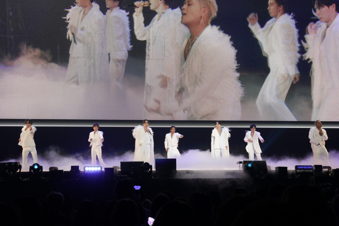 怒涛の展開で進む前半戦。先日11月10日(月)のデビュー日に10th Anniversary REMASTEREDバージョンがリリースされた、三代目 J SOUL BROTHERSの代表曲「R.Y.U.S.E.I.」では、しっとりとした曲調で始まるイントロから、次第にアップテンポな展開へと移り変わる構成で、日本中に親しまれるヒット曲の新たな一面を見せた。