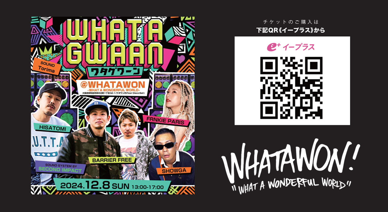 『WHATAGWAAN』は、大阪・岸和田から新たなレゲエムーブメントを発信するイベント。イベントタイトルは、ジャマイカのパトワ語で「ワーグワン(=調子どう?)」を意味する言葉に由来するという。当日は、BARRIER FREE、HISATOMI、FRNKIE PARIS、SHOWGA、Torimaが出演することが決まっている。