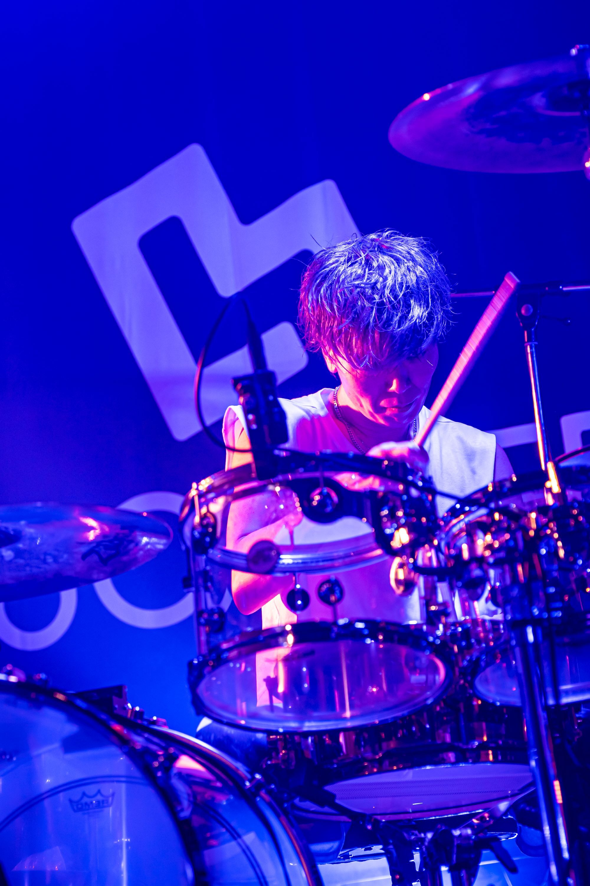LOVE大石(Dr)、たく(Ba)、ikoma(Gt/Cho)、PON(Vo/Gt)の順でステージに登場し、「ファンファーレ」のイントロを鳴らすと観客が掲げた拳とともに高らかな歌声を響かせライブがスタートする。ポップでありながらも骨太で、安定感と躍動感を持ち合わせた歌と演奏は、ステージで自身の音楽を鳴らし続けたバンドだからこそ成し得るものだ。ドラマカウントでつないだ「初めの一歩」ではフロアからコールとシンガロング、クラップが巻き起こり、バンドと観客の阿吽の呼吸も目覚ましい。「サニーデイ」も大石のパワフルなドラム、たくの洒落たベースライン、ikomaの晴れやかなギター、PONの情熱的な歌声が一挙に合わさり、瑞々しくフレッシュな空気を作り出した。