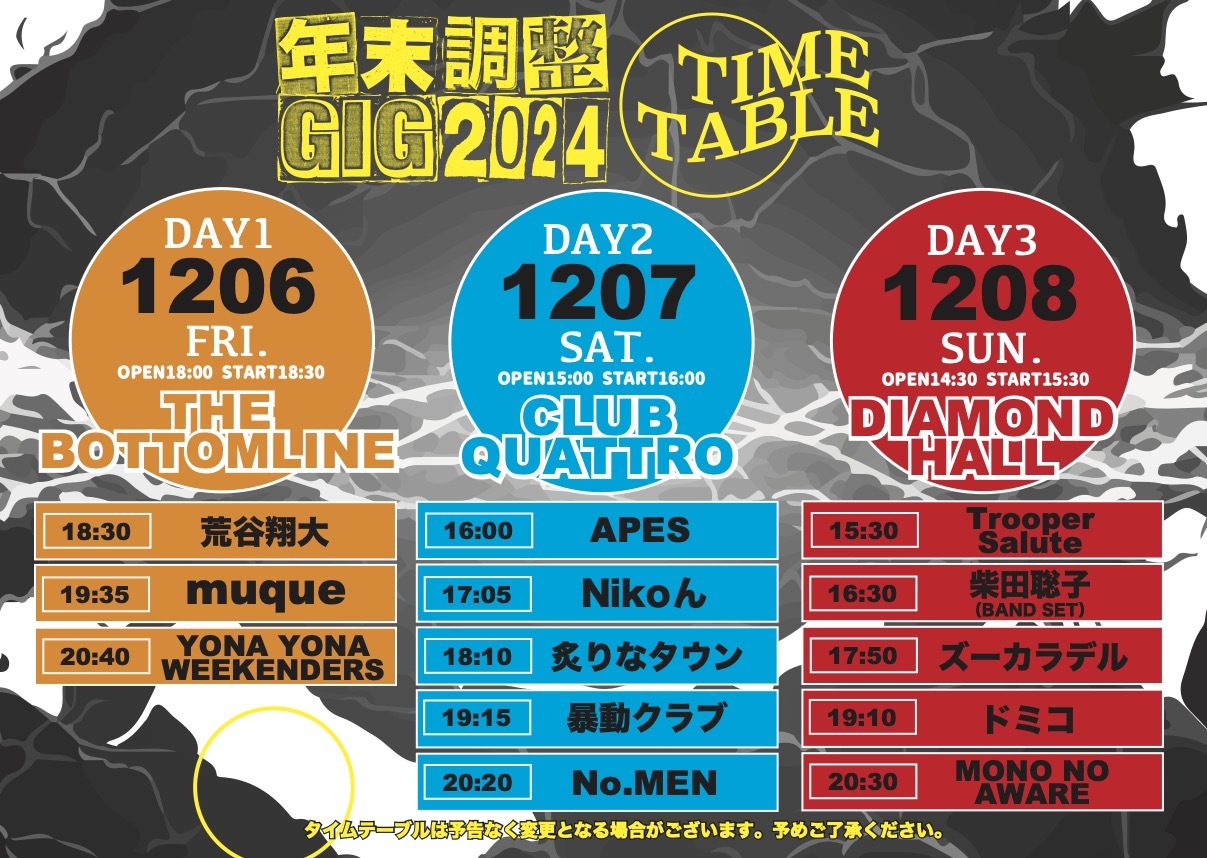 12月6日(金)~8日(日)に、それぞれ名古屋のTHE BOTTOM LINE、CLUB QUATTRO、DIAMOND HALLにて開催される『年末調整GIG 2024』のタイムテーブルが発表された。