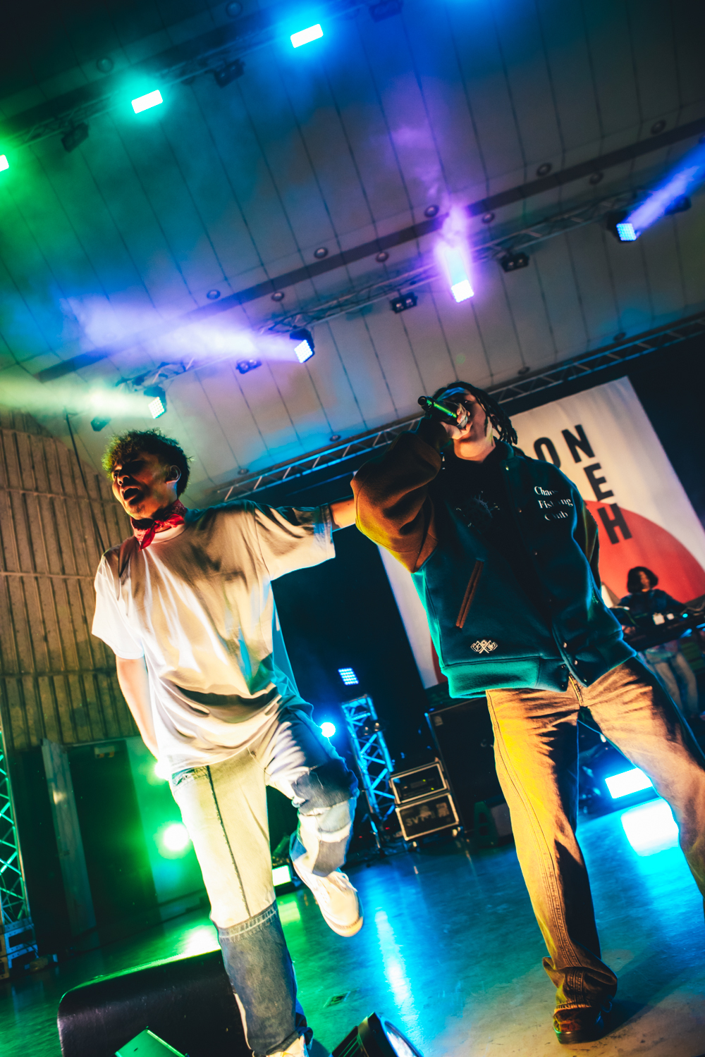 「脳内麻薬」「日の出る国」「JUMP UP」を歌ったRAY。「ラバダブ」は、彼とVIGORMANの共演となった。少し雨が降ってきていたが、ライトを浴びた雨粒がキラキラ輝くのが綺麗。腕を振り上げながら盛り上がる人々の熱気に包まれていると、雨はまったく気にならず、いつの間にか天気は回復していた。LIFESTYLEがプロデュースを手掛けた能登半島復興応援ソング、12人がマイクリレーを繰り広げる「HINOMARU REVIVAL」がプレイされると、自身のパートを歌ったVIGORMAN。そしてLIFESTYLEのステージは、NG HEAD withヤマカシBAND 「人にやさしく」で締めくくられた。