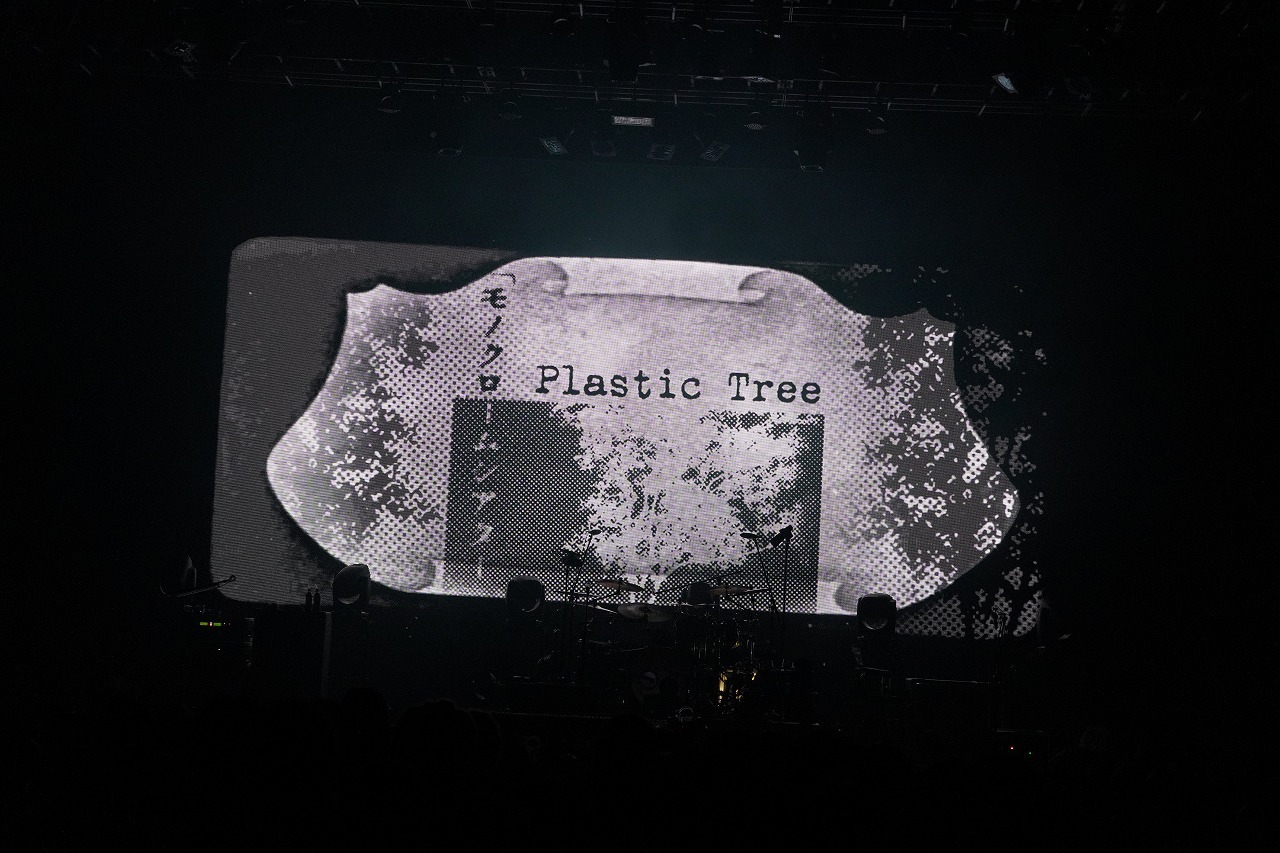 なお、演奏が始まる前のオープニングSEとしてまず場内に響き出したのはPlastic Treeの1stオリジナルアルバム『Starnge fruits -奇妙な果実-』(1995年12月発売)収録の「Rusty」を元に作られた独自インストルメンタルだったようで、その音とともにステージ上にしつらえられた大型ヴィジョンでは、それこそモノクロ映画のごとき映像が上映されていくことに。