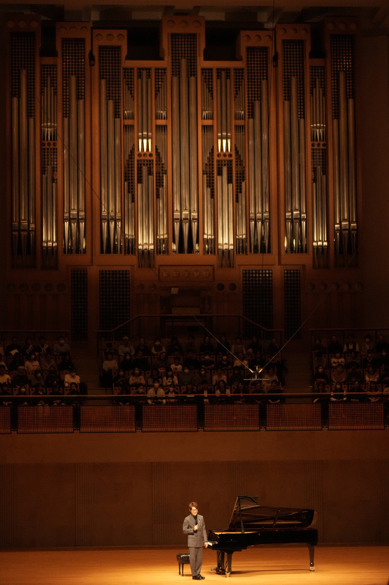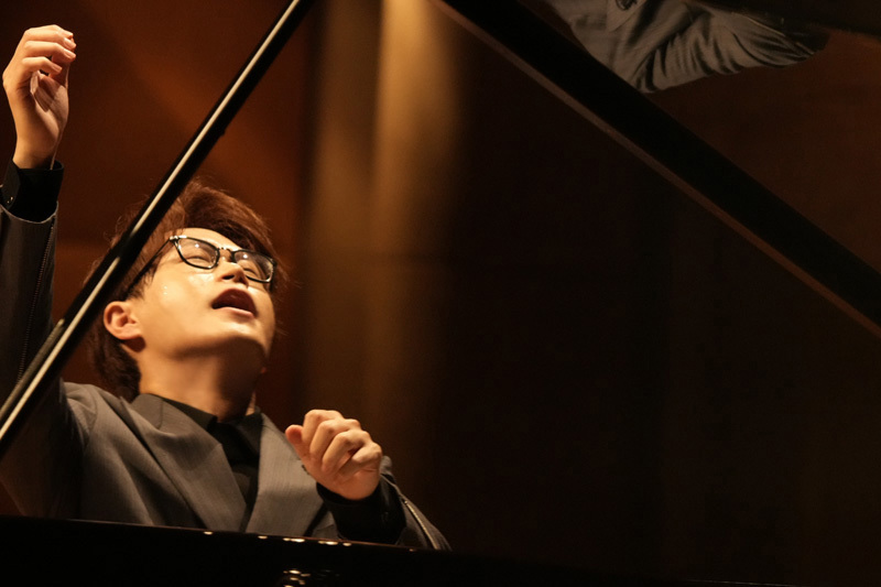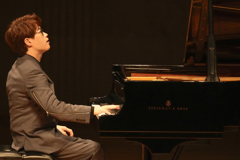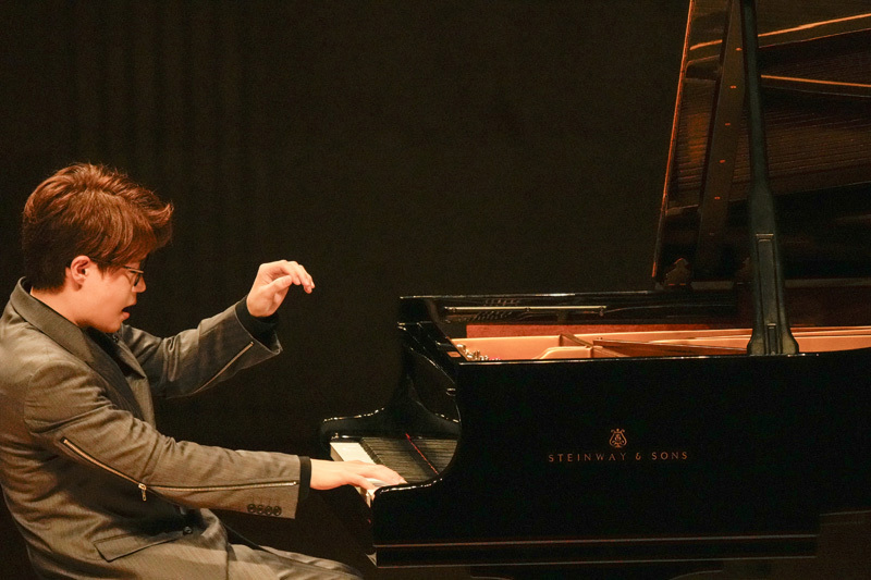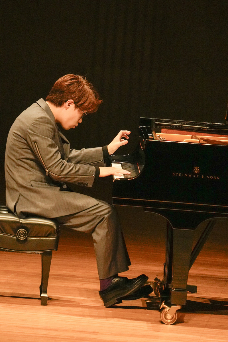後半では、坂本龍一がブラームスをオマージュした「インテルメッツォ」と、ブラームスの間奏曲Op.118-2を並べた。坂本作品ではブラームスへの敬愛を厚みある和音の方向性でしっかりと示し、一方のブラームスは豊かなダイナミクスの変化と、よく整理された声部で繊細にプレゼンテーションした。菊池亮太に「リストの『ラ・カンパネラ』風の編曲で」と依頼した「チム・チム・チェリー」は、かなりのヴィルトゥオーゾ的作品。リストのモチーフを多用しながら、ドラマティックな展開で名作の熱量を伝えた。