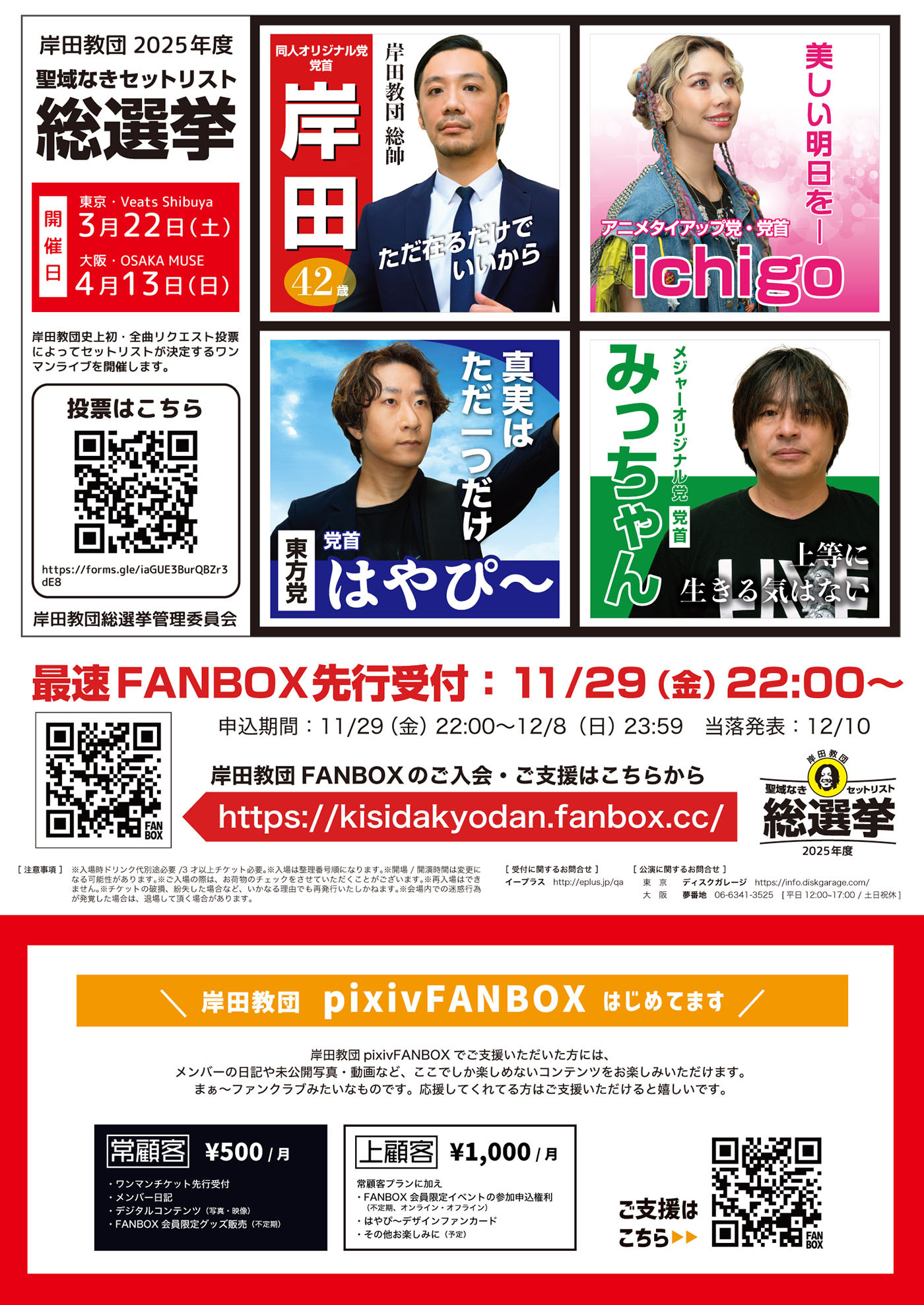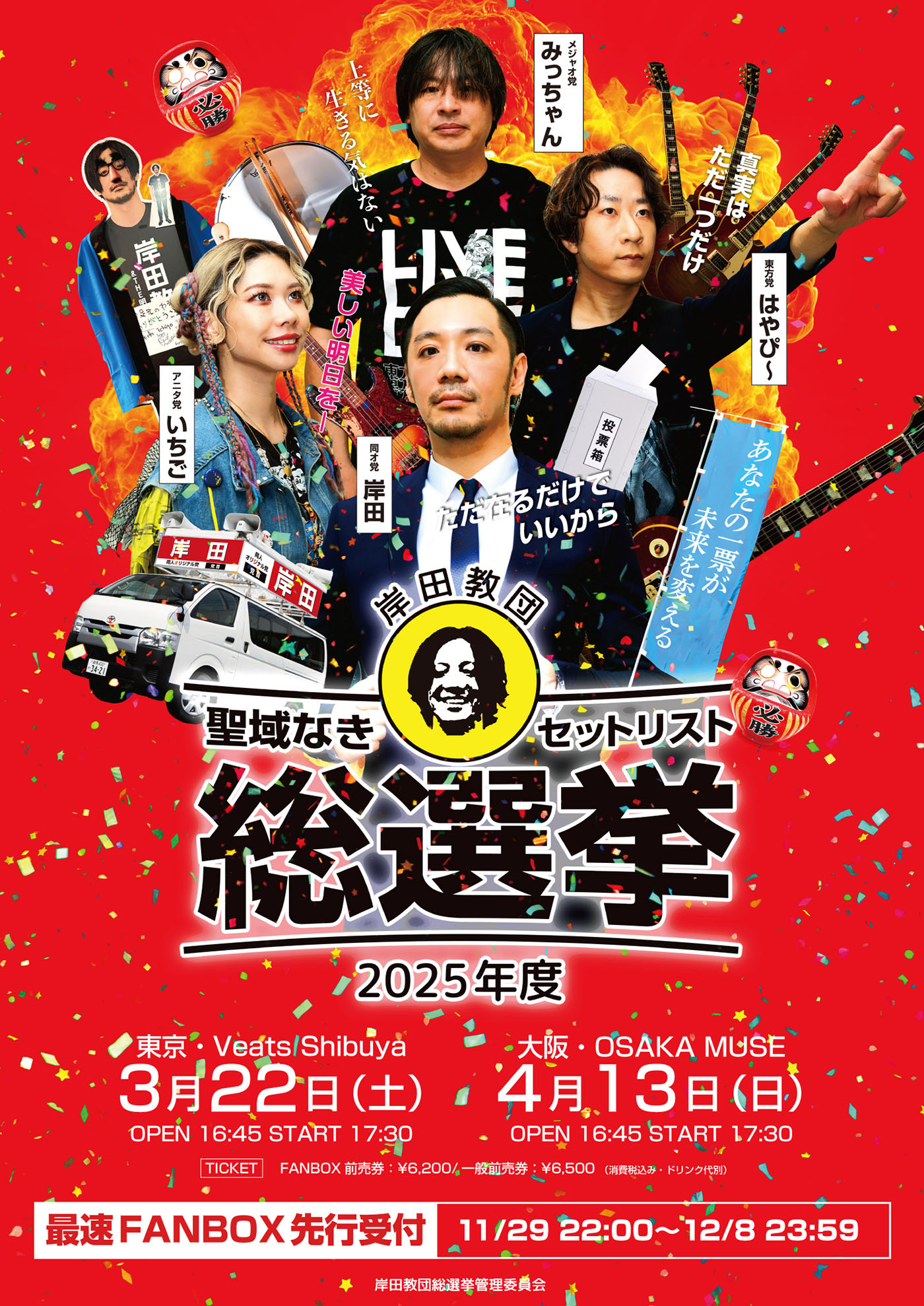 情報解禁に伴い、チケット最速先行受付も開始された。今回の先行受付は岸田教団のファンクラブとして運営をしている「FANBOX」にて支援者が対象のものと、さらにはFANVOX支援者だけではなく全員対象のオフィシャル先行受付は12月16日(月)正午12:00より始まることもあわせて発表された。