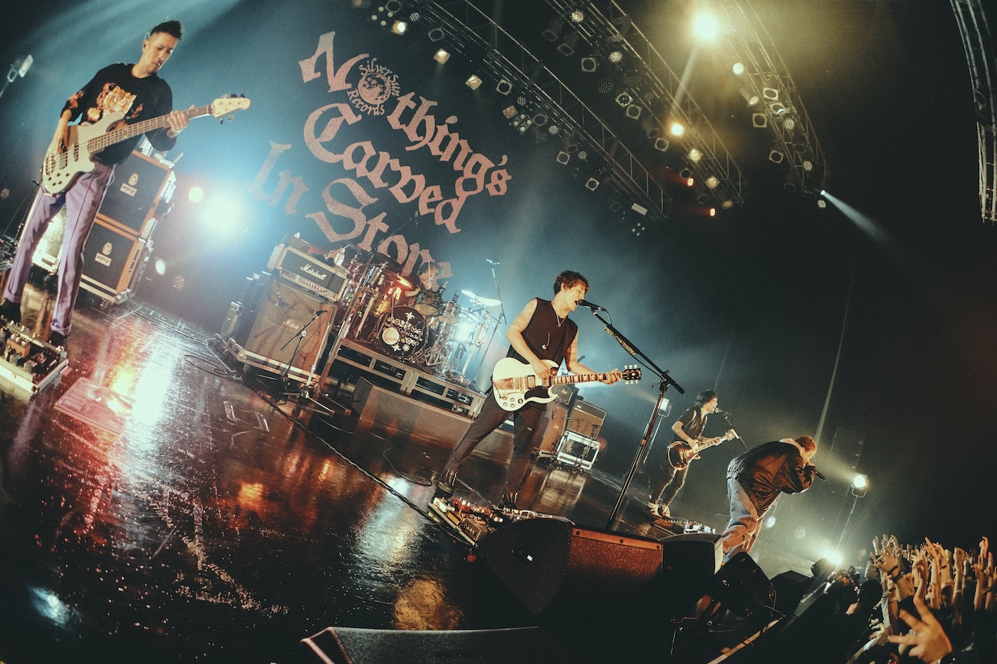 ライブ終盤、朱赤色の照明がステージ全体に落ちると、新曲「All We Have feat. Masato (coldrain)」のイントロがスタート。最初は4人のみであったが、楽曲途中でcoldrainのMasatoがゆっくりと姿を見せ、そのままステージの中央へ歩みを進めていく。突然の登場に驚く観客からは大きな歓声が湧き起こった。会場を大きく揺らす強烈なシャウトをかますMasatoに、いつもにも増してラウドでストイックな音を鳴らすNothing’s Carved In Stoneの4人が共鳴しあい、破壊力全開の化学反応を生み出していく。