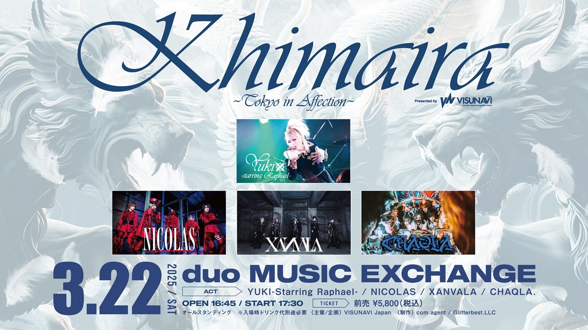 「新世代ヴィジュアル系元年」を謳いレギュラーイベントとして今年4月に始動した『KHIMAIRA』の、2025年第1弾となる『KHIMAIRA-Tokyo in Affection-』が3月22日(土)に渋谷duo MUSIC EXCHANGEで開催される。出演するのは、YUKI-Starring Raphael-、NICOLAS、XANVALA、CHAQLA.の4バンドだ。
