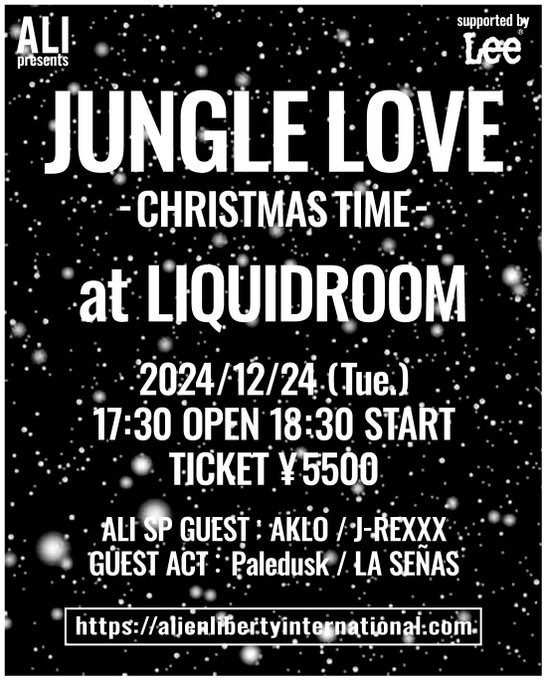 ALIは、12月24日(火)に東京・恵比寿LIQUIDROOMにて自主企画ライブ『JUNGLE LOVE-CHRISTMAS TIME-Supported by Lee』を開催する。チケットはイープラスほかにて、12月23日(月)18時まで一般発売中。