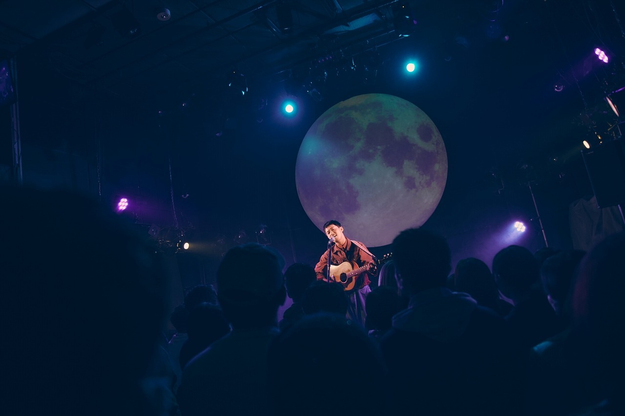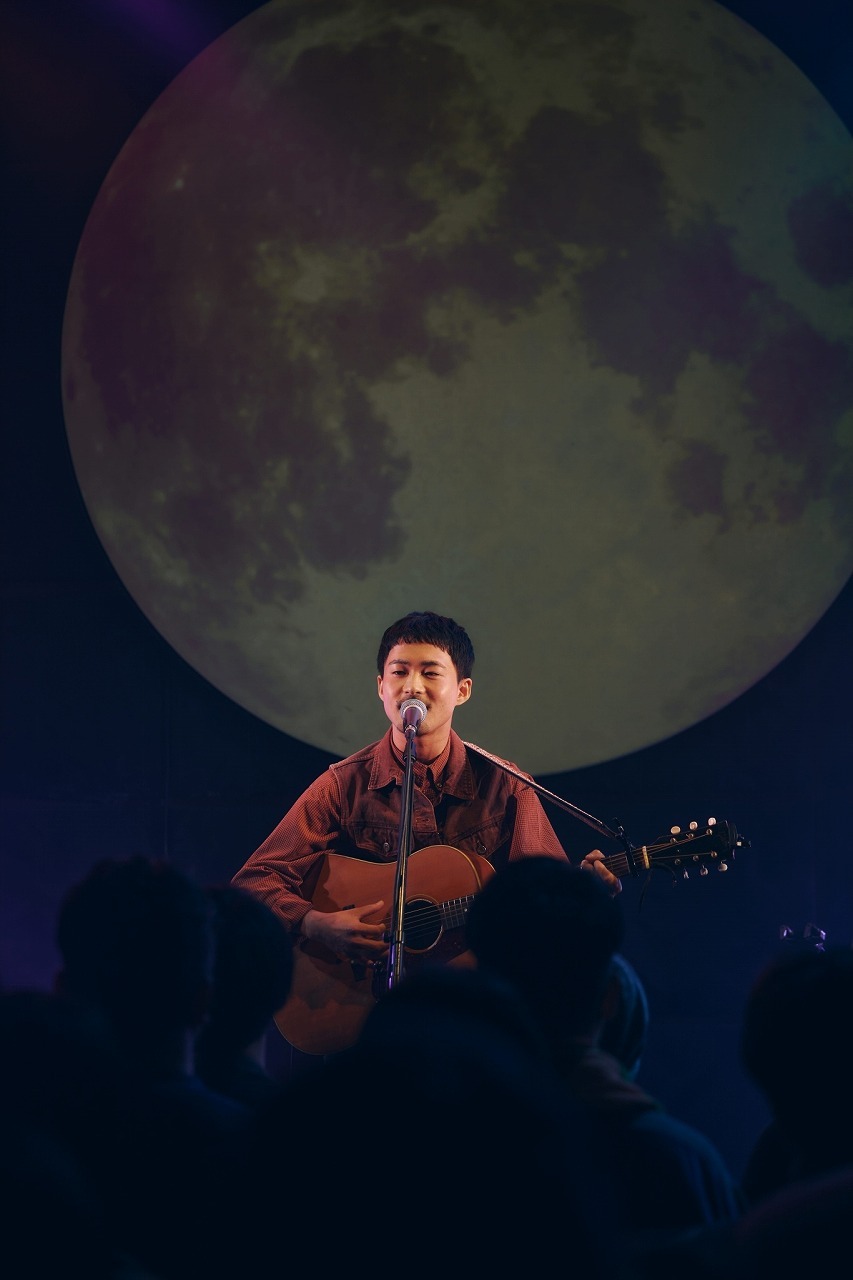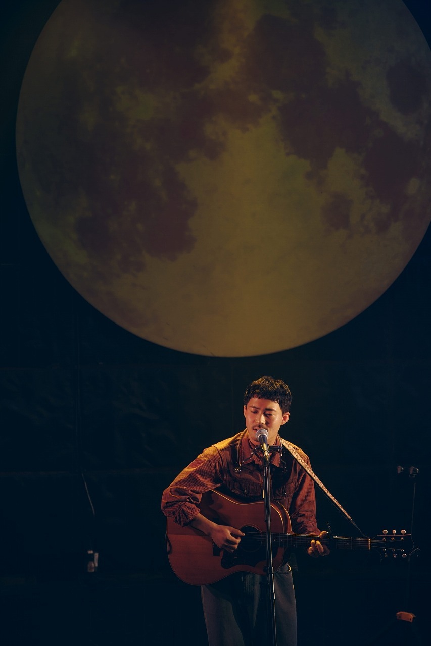 「みなさんの健康をお祈りしまして、「健康」という曲を」。4ビートのリズムでジャジーなムードを醸し出し、淡々と歌い口笛を吹く。曲間でチューニングをドロップすると、「月見ル君想フは初めてなんですけど、月にまつわる曲がないかな、と思って探したら、全部で1曲ありました(笑)」と告白。工藤の11曲との対比に一斉にドッと笑いに包まれた。その1曲、「月の兵士」を歌い出すと、観客たちはしんと静まり返りじっとステージを見つめて聴き入っている。ワンコードでルート音が変わっていくギターと切々と歌われる意味深な歌詞、ハイトーンのコーラス、バックの月と重なって夜空のサウンドスケープを描く。歌い終わると大きな拍手が沸き起こる名演だった。