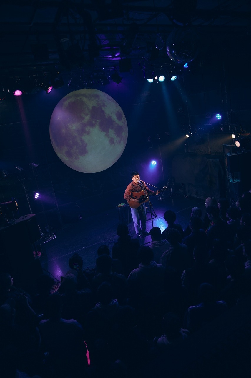 まずは工藤がステージに上がり、「キャンプキャンプキャンプ」からライブをスタート。鼻歌を歌うようなリラックスした歌声が心地良い。「月見ル君想フでライブをやるのは久しぶり。せっかくなので歌詞に月が出てくる曲を探したら、全部で11曲ありました」ということで、月にまつわる11曲を披露することを告げて、ラグタイム調の「犬と私」へ。《ひとりぼっちで歩く 月を背に》と歌った「花街道」では、ステージバックの大きな月を指して「月を背に、ですね」とニッコリ。ギターを背後に回してウクレレで歌い上げたり、幻想的な音像でストロークしながら歌ったりと、月を歌詞に織り交ぜた曲を次々と披露した。「その昔、夏目漱石先生が、“I love you”を“月が綺麗ですね”と和訳したという都市伝説めいた話があって、二葉亭四迷先生は、“死んでもいいわ”と訳したという話を聞いて、“I love you”の和訳でかっこいいことを言いたいなと思っていた時期があって。“今度うなぎでも食べにいきましょう”っていうのが“I love you”の和訳としてめちゃくちゃ良いんじゃないかと思って書いたラブソングを歌います!」と、「東京うなぎ」へ。疾走するポップソングで独特な愛情表現を聴かせた。終始飄々としつつ、ほっこりする歌声と見事なギター演奏で、「よるのとしょかん」(chelmico鈴木真海子との共演曲)を歌い、静かな夜の余韻を残して眞名子にバトンを渡した。