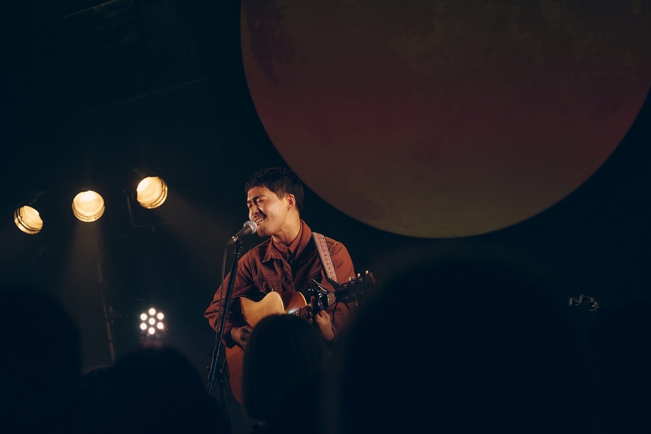ハーモニカホルダーを首から提げて、「(イベント名が)“淡水”ということで」と曲紹介して、「川沿い」へ。清廉な水の流れを思わせるようなアルペジオと伸びやかなボーカルで歌うと、フロアでは一緒に口ずさむお客さんも。対照的に弾むような3フィンガーと力強いストロークで聴かせた「大移動」では、ギッシリ埋まったフロア中で体を揺らし声に身をゆだねている。続く全編英語詞の曲「The translator sings」では、大阪では成功したという歌詞のコール&レスポンスを求めて、歌う前にレクチャー。観客のクラップに乗せてカントリータッチで疾走しながら、該当箇所に来て《Sushi restaurants》と歌うと、《レストラン!》と一斉に声が集まり、同様に《Spinning》と歌う箇所もレスポンスが返ってきて、大成功となった。