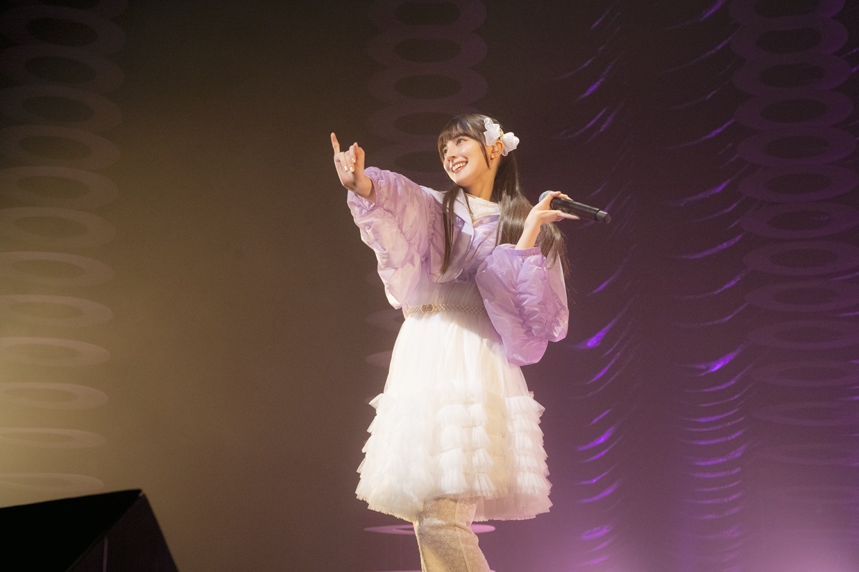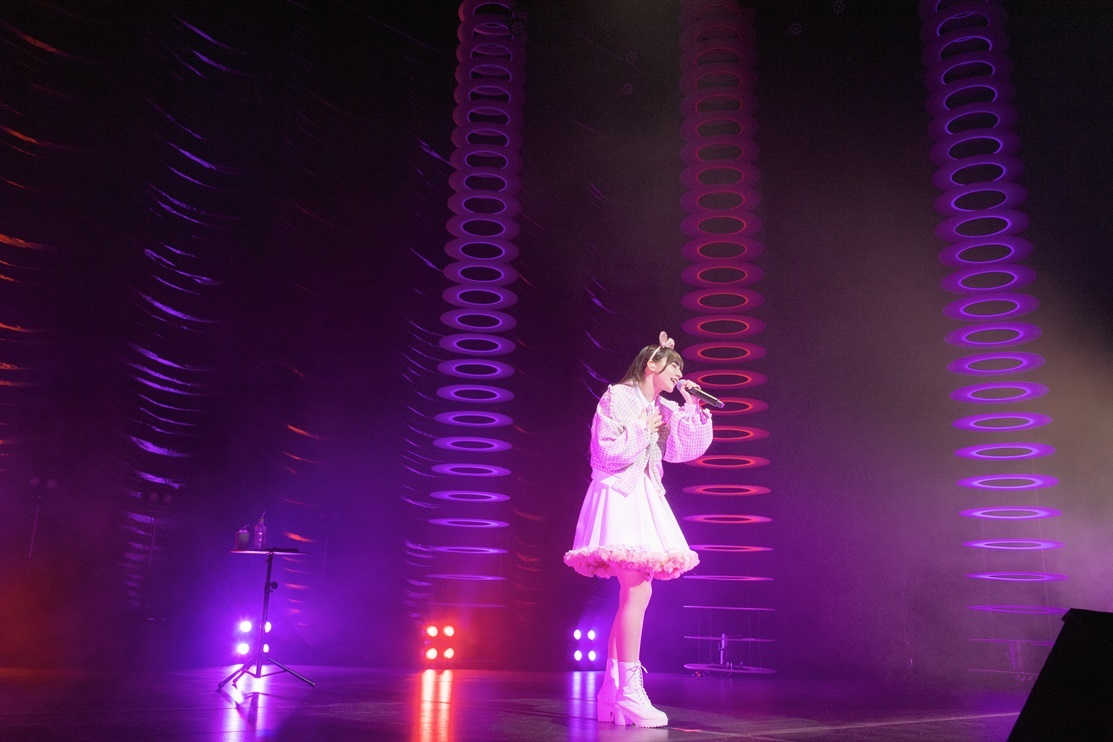 1曲目は自身の1stシングルの表題曲でもある「魔法」。聞く人の背中を押す前向きな歌詞の様に、『共に行こうよ 夢見たあの場所まで』と真っすぐに歌い、会場に集まった“浪漫派(ファンネーム)”へ手を伸ばす姿は、可愛さの中に、会場全体を先導する“逞しさ”をも感じさせた。続いて披露した「キミが手を握ってくれるのなら」では、前曲「魔法」で差し伸べた手をファンと取り合うかの様なストーリーに、ぐっと引き込まれる。