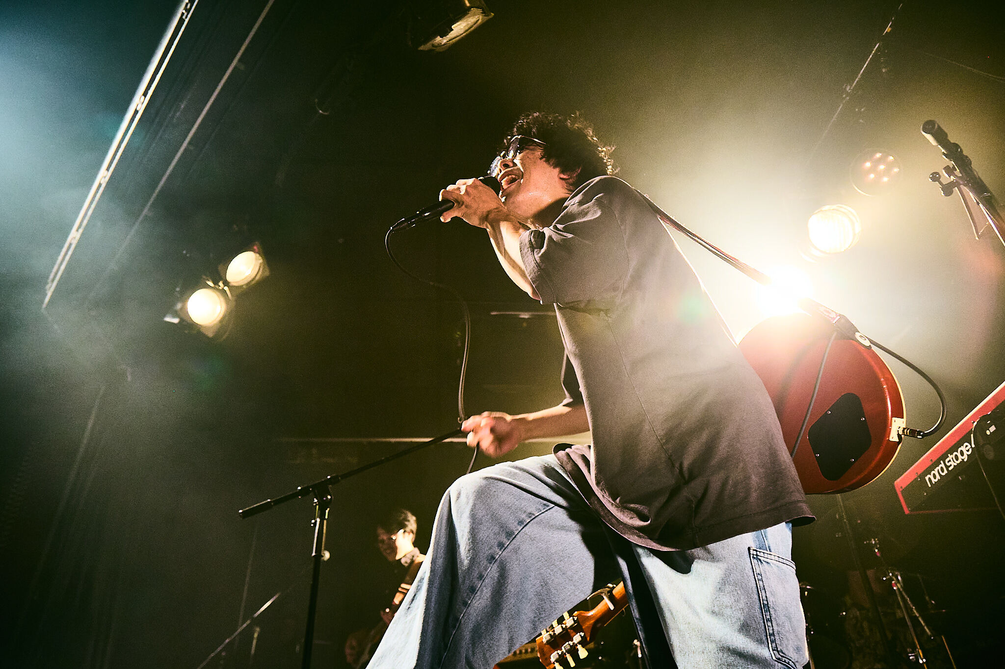 アップテンポの演奏に食らいつくように手を打ち鳴らす観客とともに盛り上げたパワーポップ・ナンバー「右へならえ」では、サビのメロディーに滲むせつなさにSPRINGMANならではと言える青(春)臭さを感じたりも。ギターをかき鳴らしながら左足を蹴り上げる荒川のアクションもキマッている。そこから「1-2-3-4!」というカウントで間髪入れずに繋げ、ドラムの2ビートとともにバンドの演奏が加速していった「いないふり」では、マイクを掴んでステージ最前線で観客に対峙する荒川の堂々としたパフォーマンスに観客が快哉を叫ぶ。