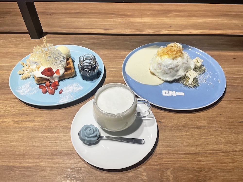 フード・デザート・ドリンクの全13種の中から今回体験したのは、Omelette Rice、Waffle、White Chocolate Milk。複数のメニューを並べて撮るとよりおしゃれに。