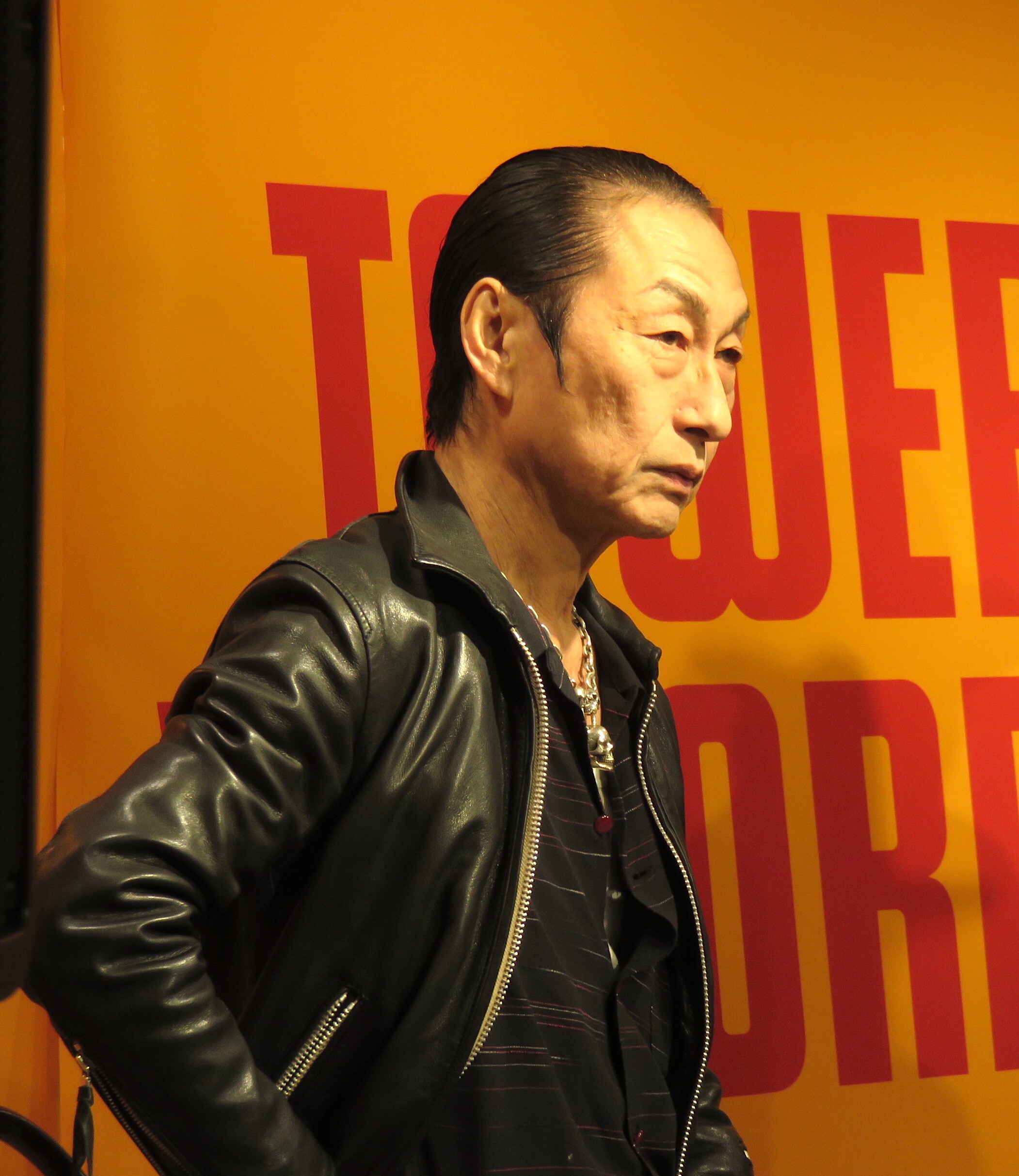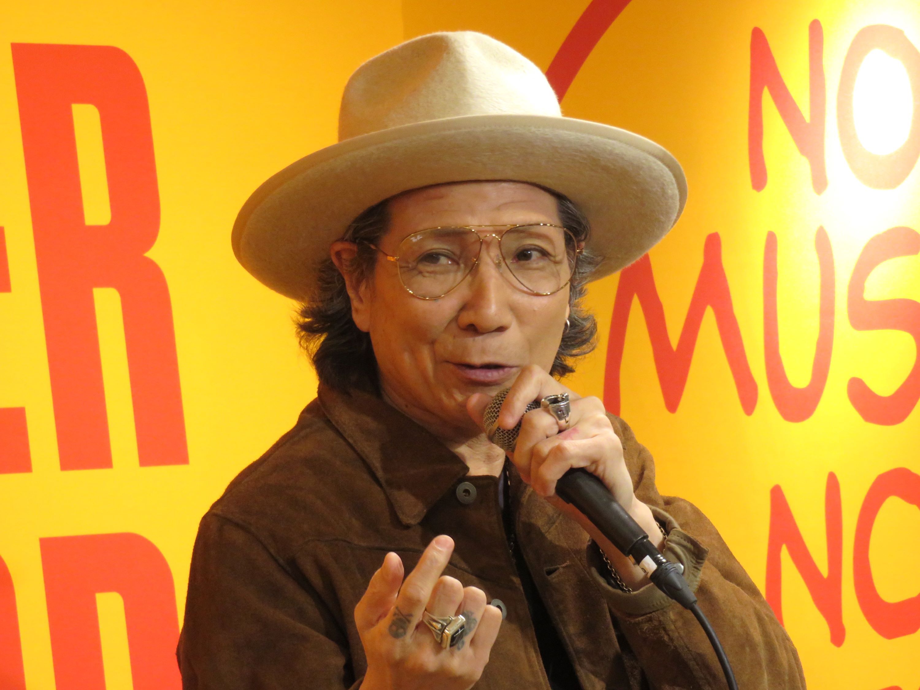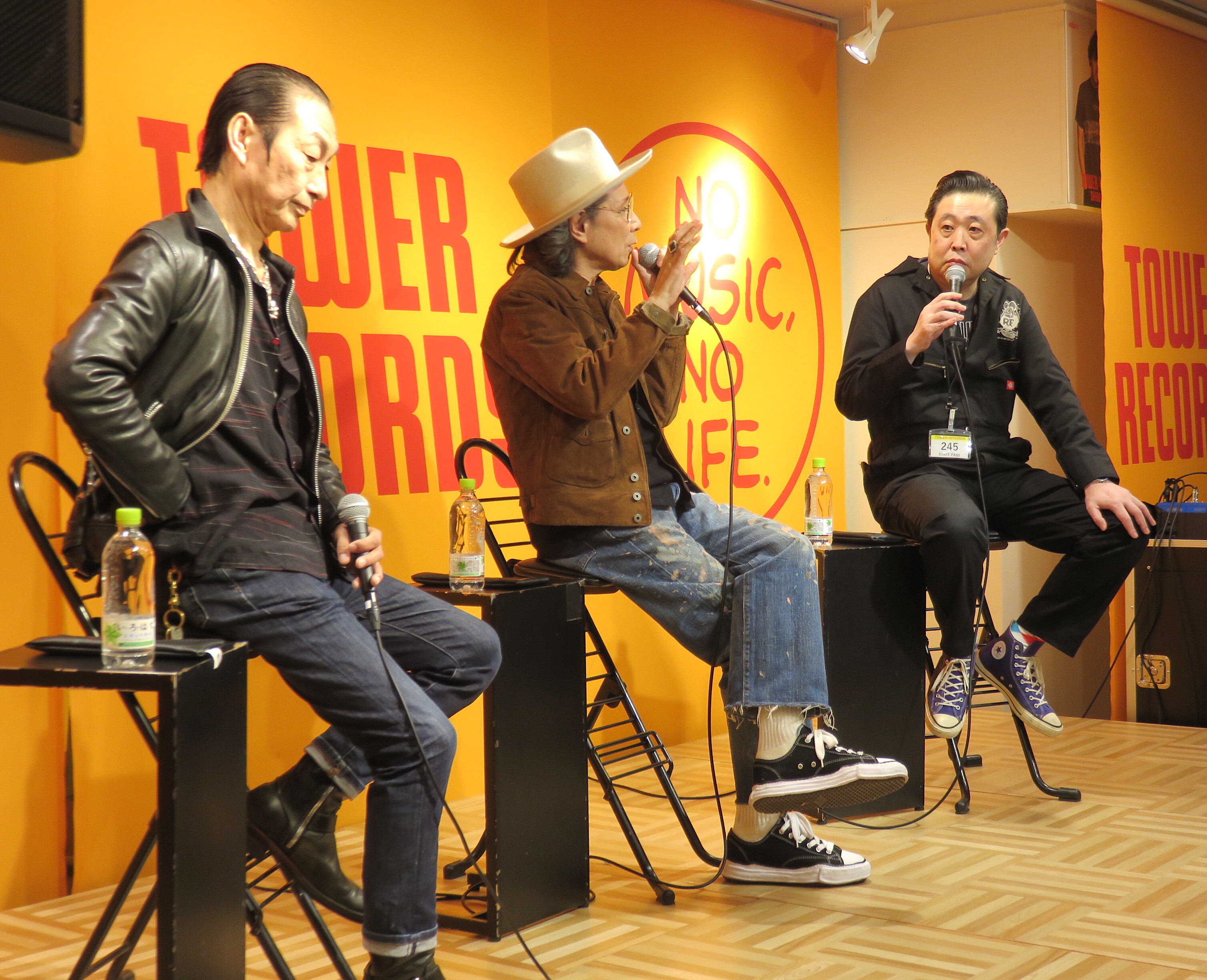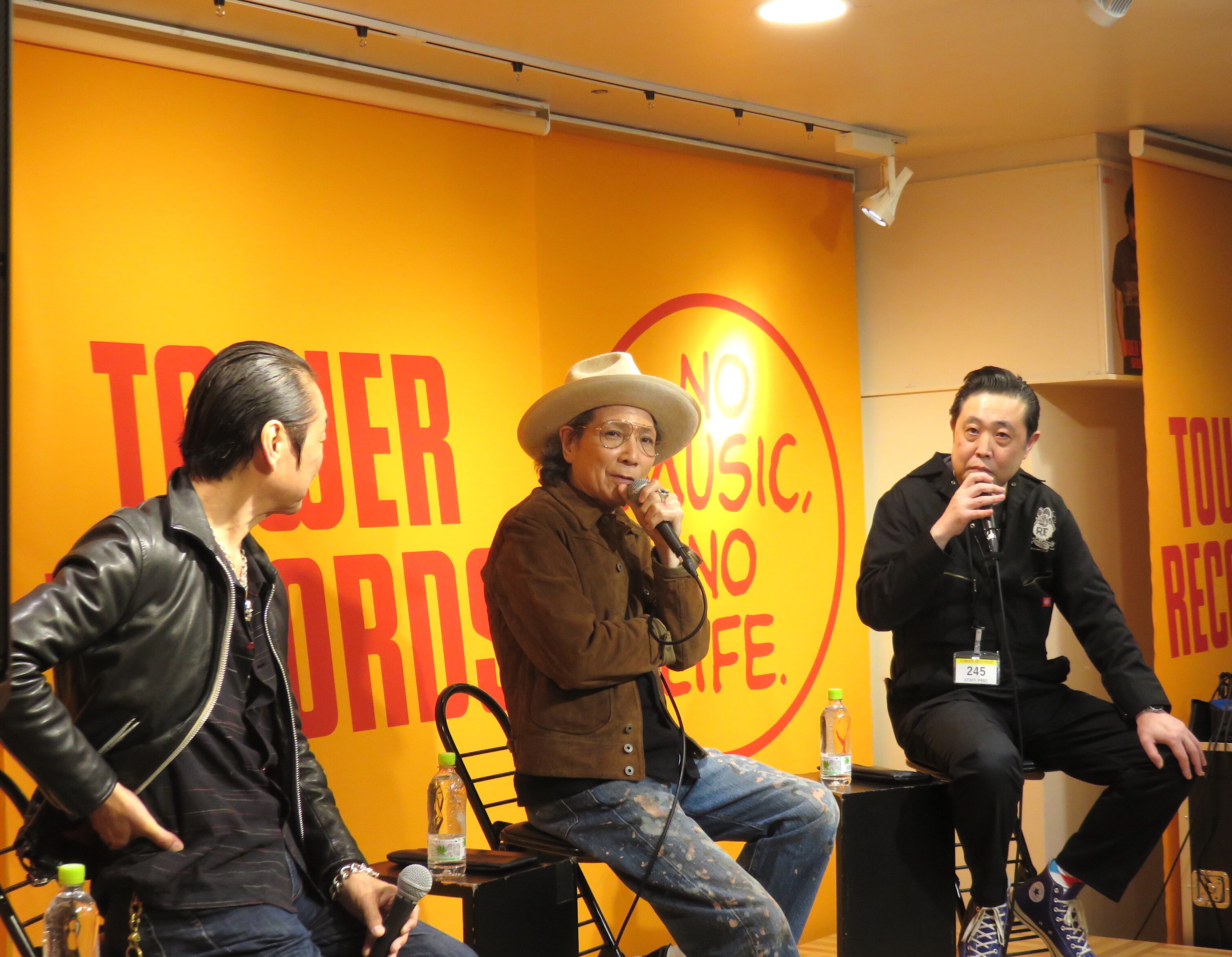 7時を少し超えてイベントがスタート、音楽ライター本田隆さんが壇上に登り森山達也さん、北里晃一さんを呼び込む。一斉に絶叫が上がり大きな拍手が二人を迎える。