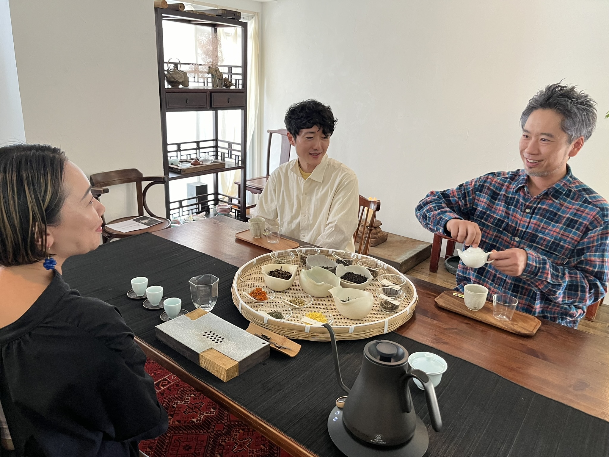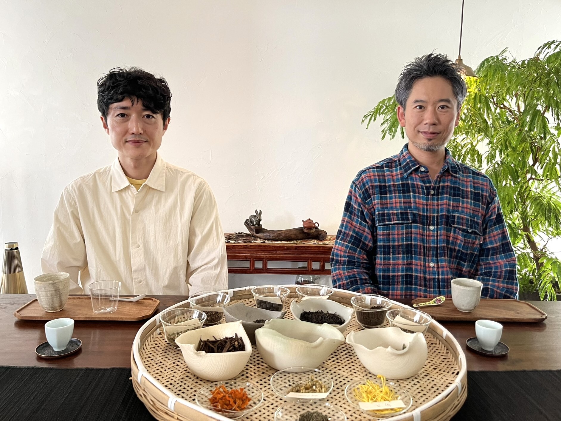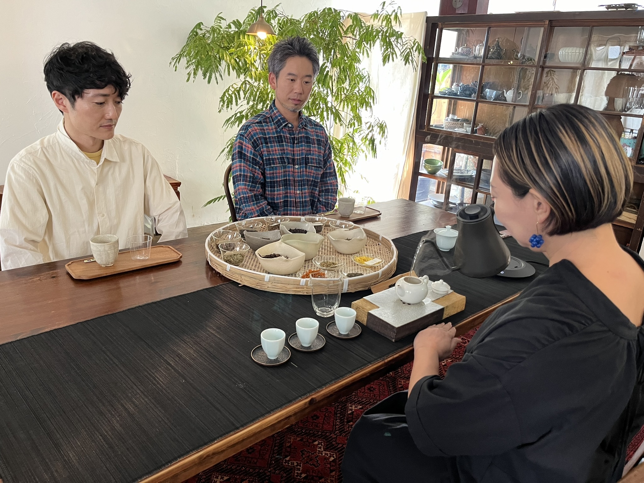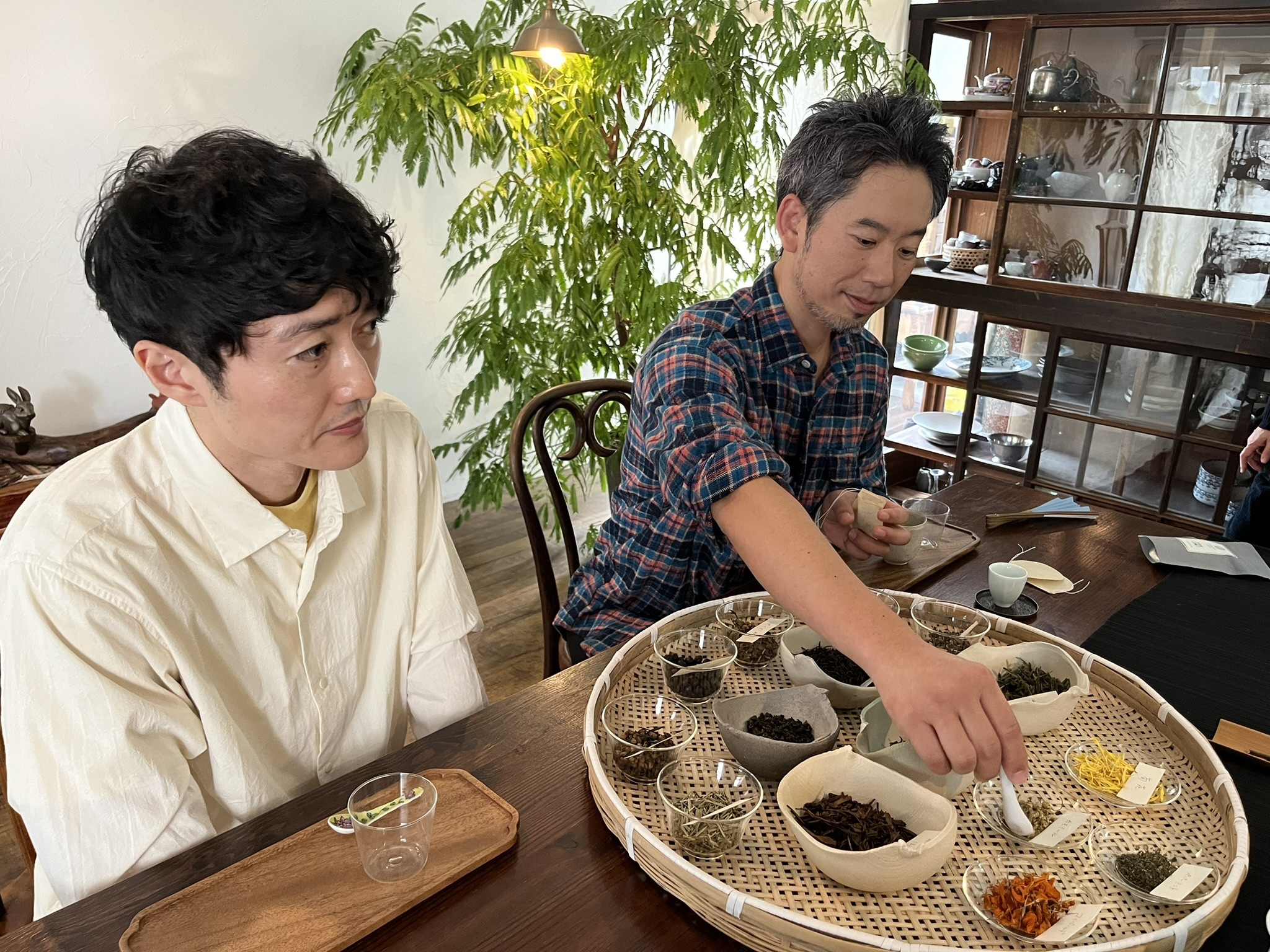 関東出身のふたりにとって、あまりなじみのない大福茶だが、健康・長寿を願うなど、考え方はおせち料理と同じ。大福茶には、“喜ぶ”のごろ合わせから、お祝いを意味する昆布や梅干を合わせることも多いが、今回は保存性も考え、お茶のみでブレンドをすることに。髙田さんが自ら薬膳の里、兵庫県・丹波市に赴き、厳選したお茶やハーブの中から、ふたりが気になるものを選んで調合・試飲し、オリジナルの「大福茶」を作っていく。