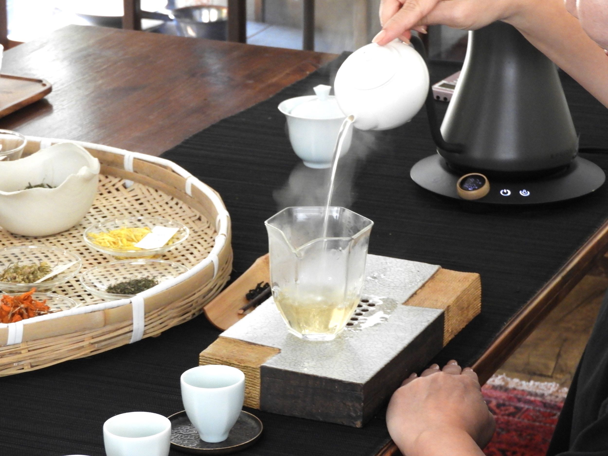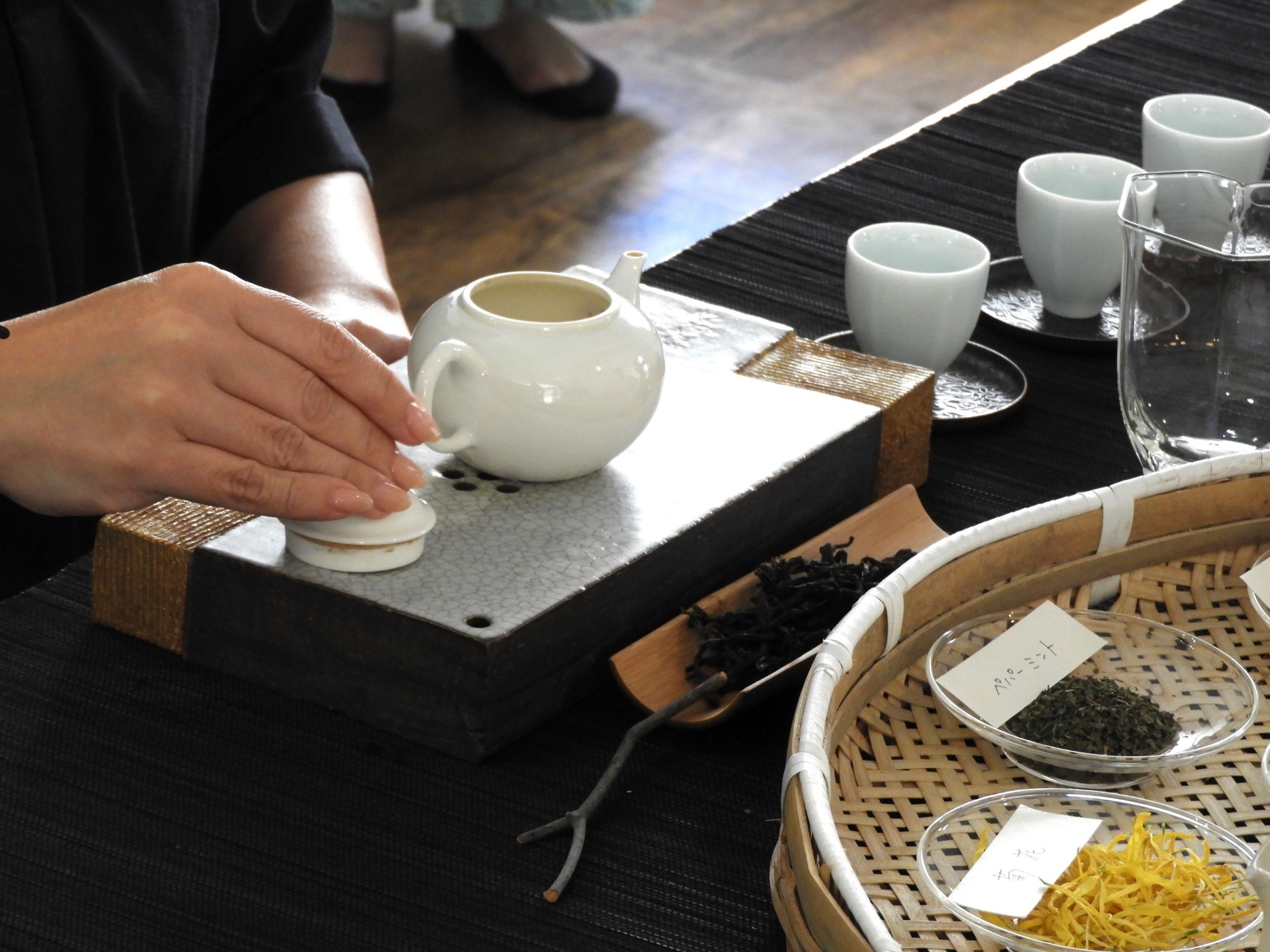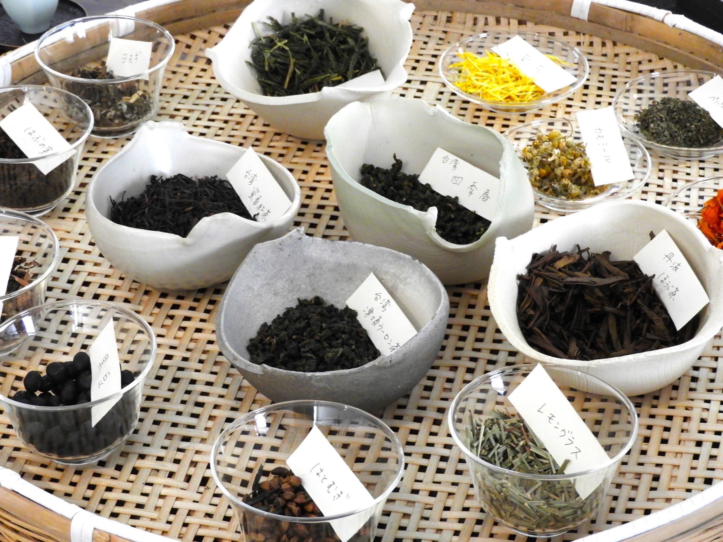 テーブルの上にズラリと並べられた材料は15種。その内、「日本のお茶を中心に選んでみました」と髙田さんが選んだベースとなるお茶は、丹波秋番茶、丹波ほうじ茶、台湾四季香、台湾密香紅茶、台湾凍頂ウーロン茶の5種。太陽をサンサンと浴びたノンストレスのお茶は体にとても良いとのこと。