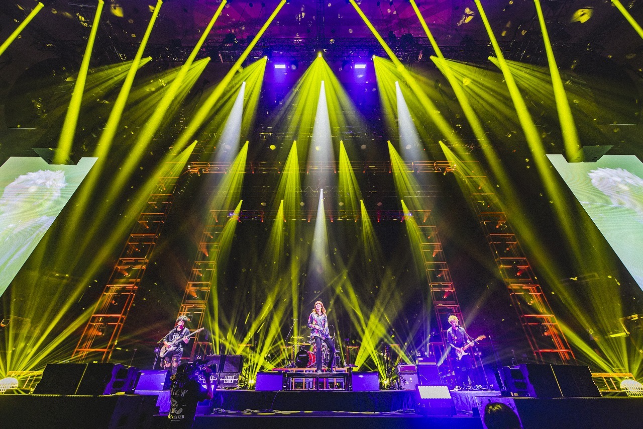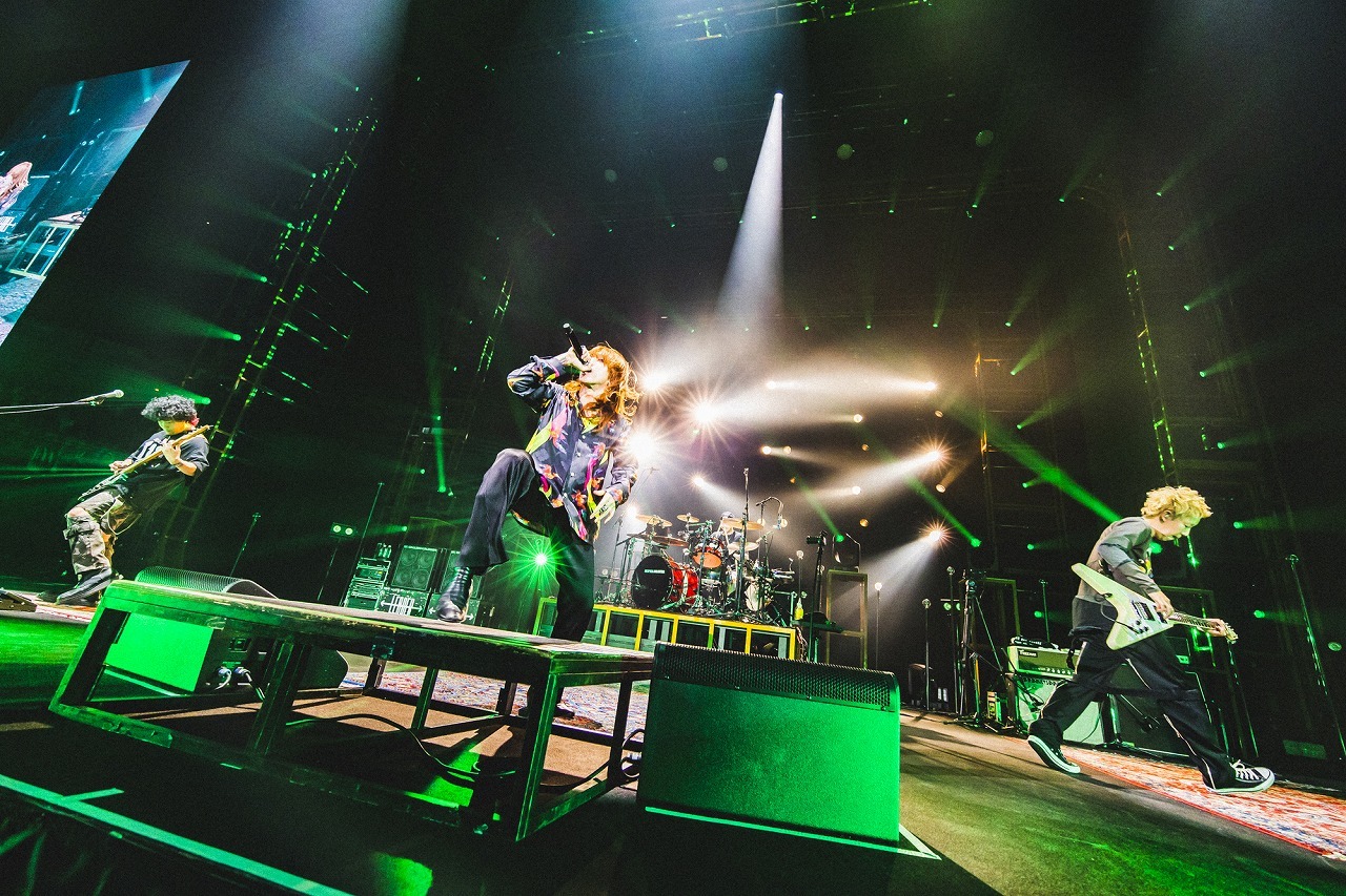 会場に入ると、老若男女、様々な人たちがステージサイドを含む客席をびっしりと埋めていた。フロアにはライブを待ちきれない人たちの熱気が充満していて、開演時刻が近づくと自然と手拍子が起きる。メンバーがステージにやってきた時点では、客席からはシルエットしか見えない状態。やがて柳沢亮太(Gt)、上杉研太(Ba)、 藤原”36才”広明(Dr)が鳴らし始めたサウンド、渋谷龍太(Vo)の登場に、観客が声を上げて喜んだ。