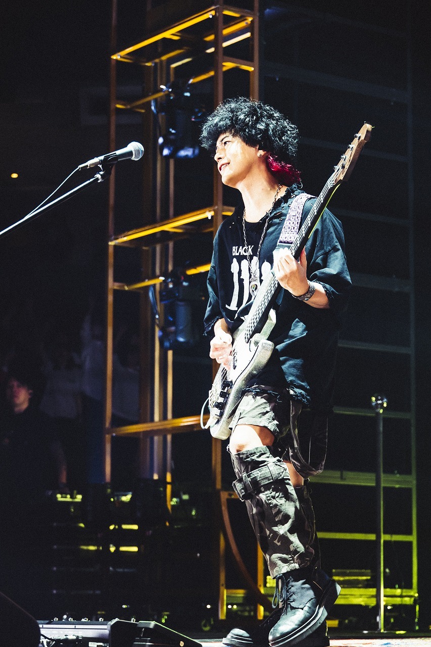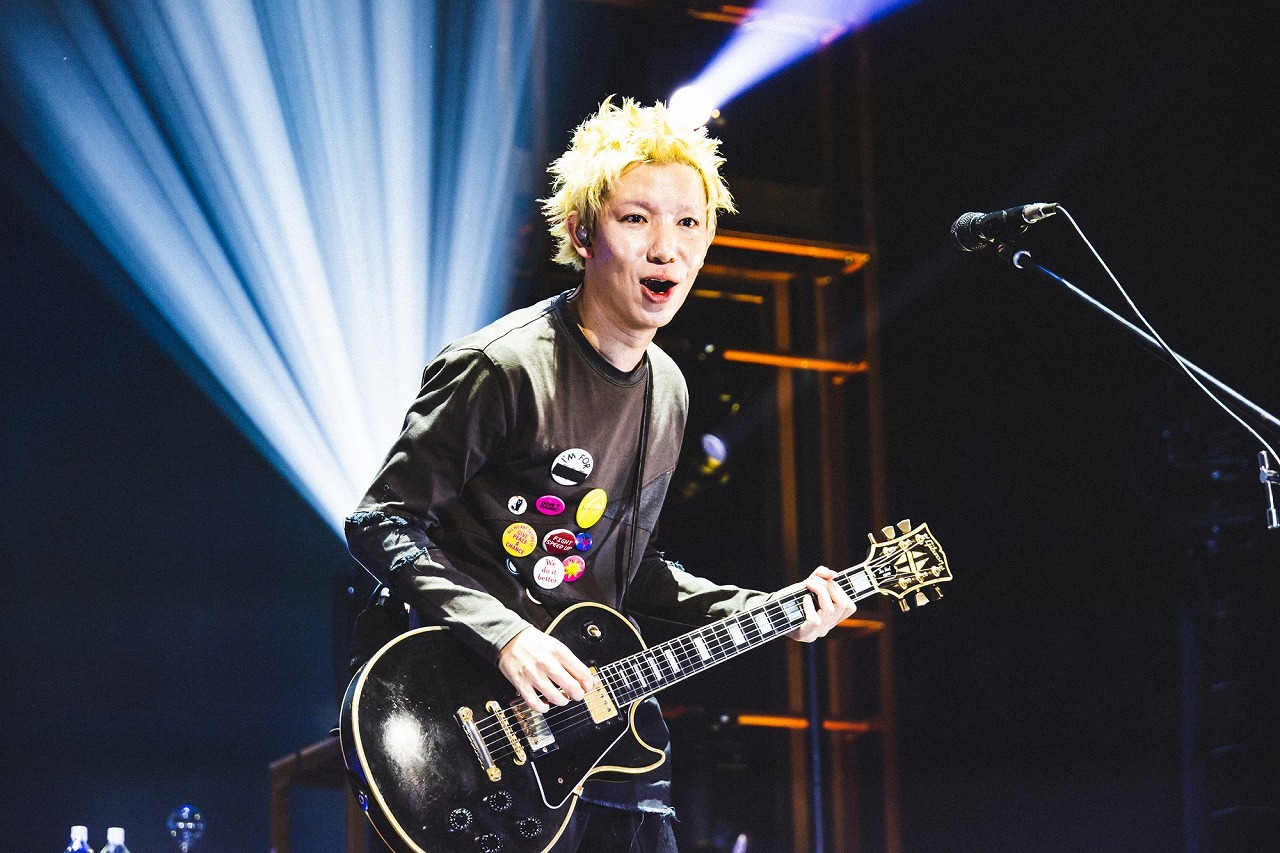 バンドの音はダイナミックで、1万人近く入る会場でも、ステージと客席がそう遠くないように感じる。“ライブハウス武道館”という先人の名フレーズがあるが、それって多分こういうこと。3人のセッションを経て柳沢のギターリフから、1曲目の「ひたむき」に突入した。バンドの音を背負いながら「お待たせ」と言った渋谷が「ご唱和いただけますか?」と投げかけると、客席から《いつだって今日が人生のピーク》と大合唱が。続いて、爆発音の特効、藤原の迫りくるような連打から「突破口」が始まると、この曲でも観客が拳を上げたり歌ったりしながらステージへエネルギーを送った。そんな中、渋谷が、ツアーを経て自分たちはやはり「その土地で生きている人の汗や涙とともにオンステージしている」と思ったと語る。「あなたがここに立ってるその意味を、存在を、しっかり見せてくれないと困るよ。最高の一日をあなたと作りに来ました。よろしくお願いします」。一人ひとりにそう伝え、次のブロックに差し掛かった。