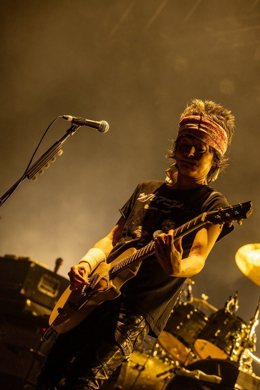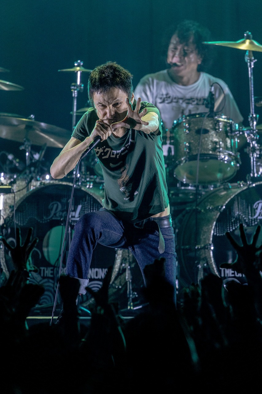 もう1曲の「自分自身」は、“自分にアイラブユーって言うってすばらしい”というメッセージも込めたサンボマスター流のディスコナンバー。近藤洋一(ベースとコーラス)のスラップベースと木内がツチドチ・ツチドチとハイアットとスネアを刻みながら、サビで鳴らすキックの4つ打ちに観客がワイプで応える。ディレイをうすく掛け、山口が軽やかに鳴らすギターのコードストロークの音色も心地いい。この曲のアウトロで山口はクロマニヨンズと2マンライブができる歓びを短いラップに乗せてみせる。