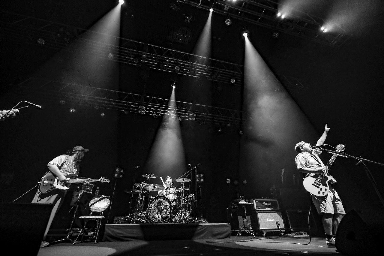ロックンロールを身上としながら、ロックンロールはロックンロールでもソウルミュージックのメロウネスが曲に滲むところがサンボ流。スタートダッシュから一転、中盤の「ヒューマニティ!」と「自分自身」の2曲ではそんな魅力も楽しませる。前者は木内泰史(ドラムスとコーラス)のドラムがドッタン・ドドタンと跳ねるポップナンバー。途中、レゲエになって観客を踊らせる。ワウを踏んでトレモロピッキングから華麗なギターソロを弾いてみせた山口は「やべえ! 俺、神様の前でもめちゃめちゃギターうまいんですけどぉ!」と自画自賛。同じステージに立つ以上は、神様でさえもあっと言わせたいと思っているようだ。