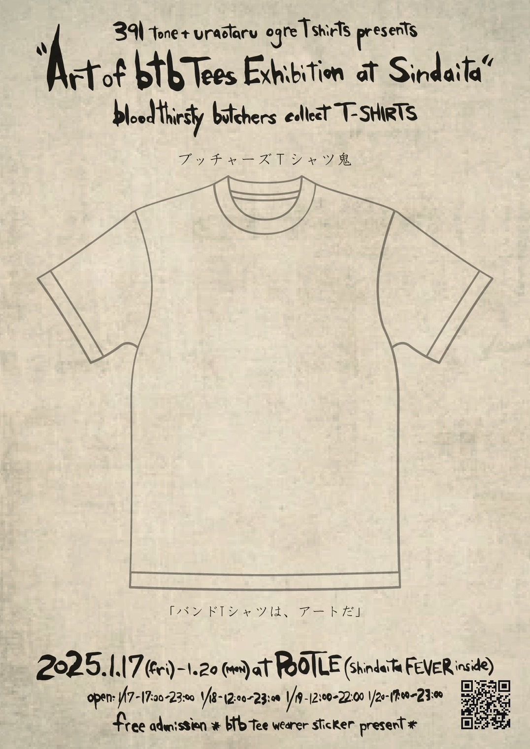 bloodthirsty butchersが2025年1月17日(金)から20日(月)までの4日間、新代田FEVER内併設のPOOTLEにてTシャツ展示『391tone & uraotaru ogre tshirts presents“Art of btb Tees Exhibition at Sindaita”ブッチャーズTシャツ鬼』を開催する。