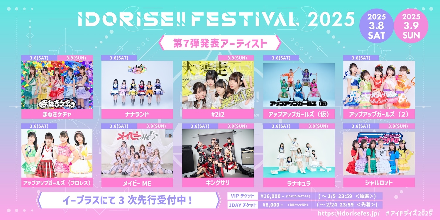 2025年3月8日(土)・9日(日)の2日間、東京・渋谷にて開催される『IDORISE!! FESTIVAL 2025』の第7弾アーティストと日割りが発表された。