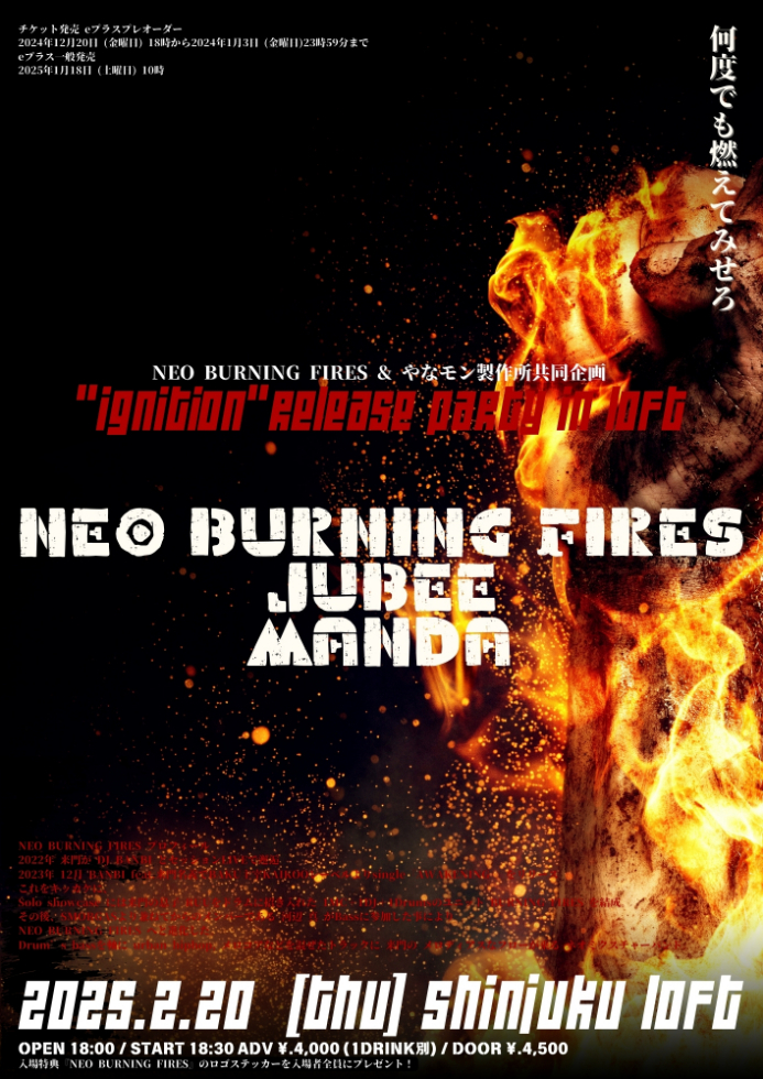 また、シングルリリースを記念し、レコ発イベント『ignition release party』が2025年2月20日(木)に東京・新宿LOFTで開催されることが決定。当日は、NEO BURNING FIRESのほか、ゲストとしてJUBEEとMandaが出演することも明らかになっている。