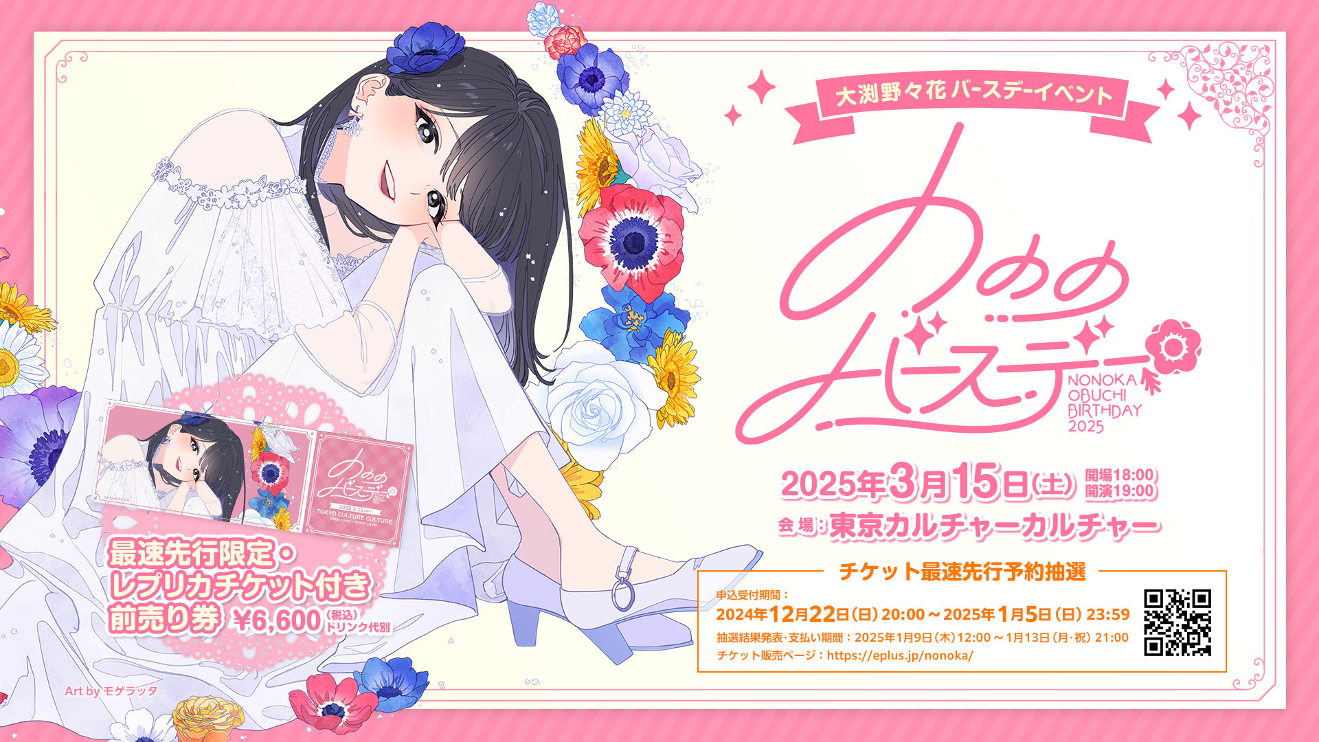 大渕にとって初のバースデーイベントとなる『のののバースデー』では、バースデーならではの企画やミニライブを実施予定。あわせて、イラストレーター・モゲラッタ氏による描き下ろしイベントキービジュアルも公開されている。