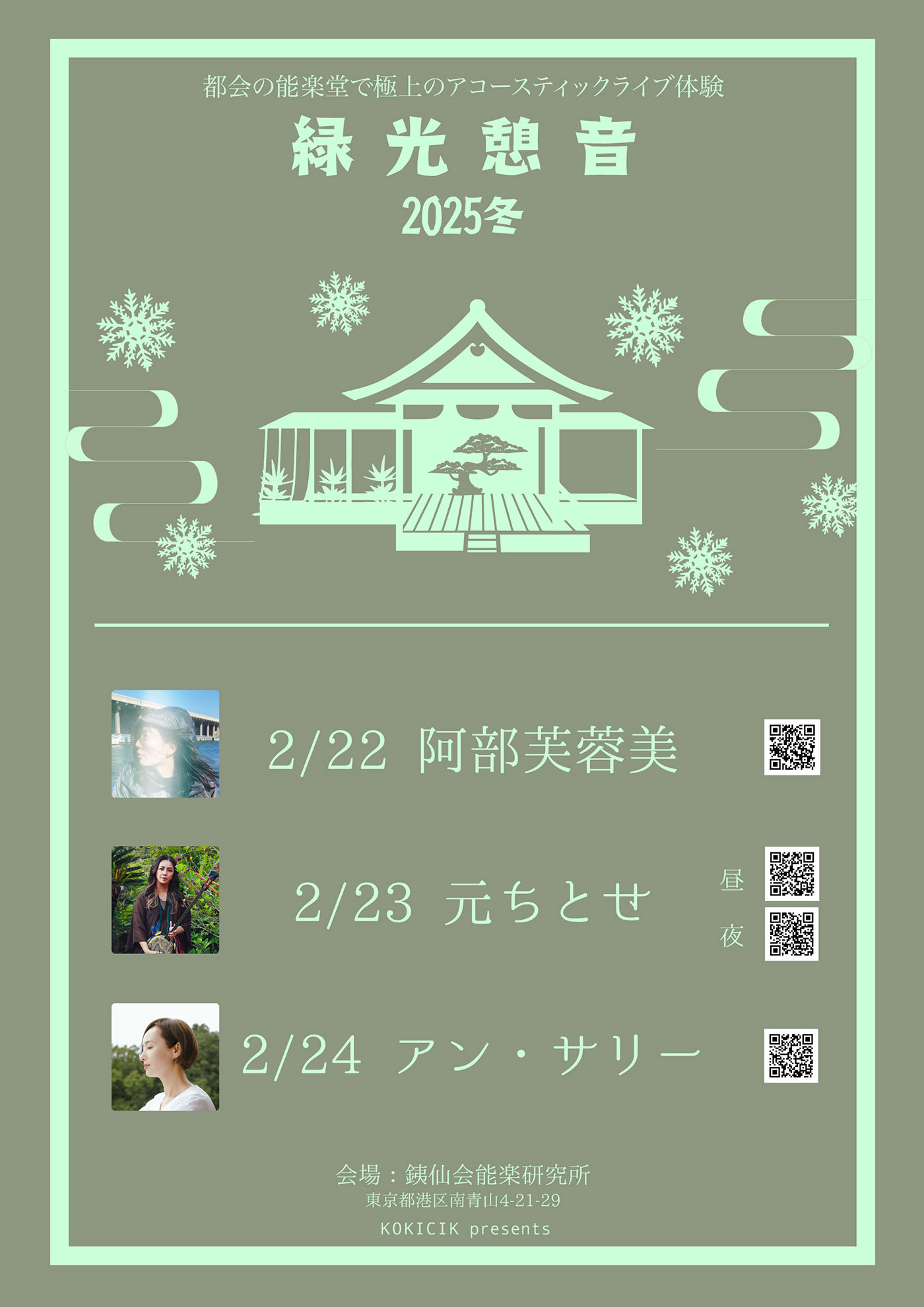 能楽堂で開催する極上のアコースティックライブ『緑光憩音2025冬』が2025年2月22日(土)、23日(日)、24日(月・祝)に開催されることが発表された。