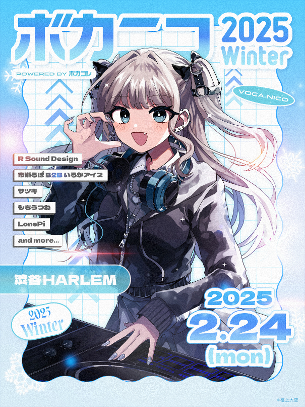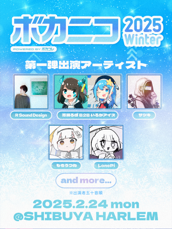 第二回となる今回の『ボカニコ 2025 Winter POWERED BY ボカコレ』では、中止となった『ボカニコ 2024 Summer OSAKA/TOKYO POWERED BY ボカコレ』で出演を予定していたR Sound Design、市瀬るぽ B2B いるかアイス、サツキ、もちうつね、LonePiらが再集結する予定だ。