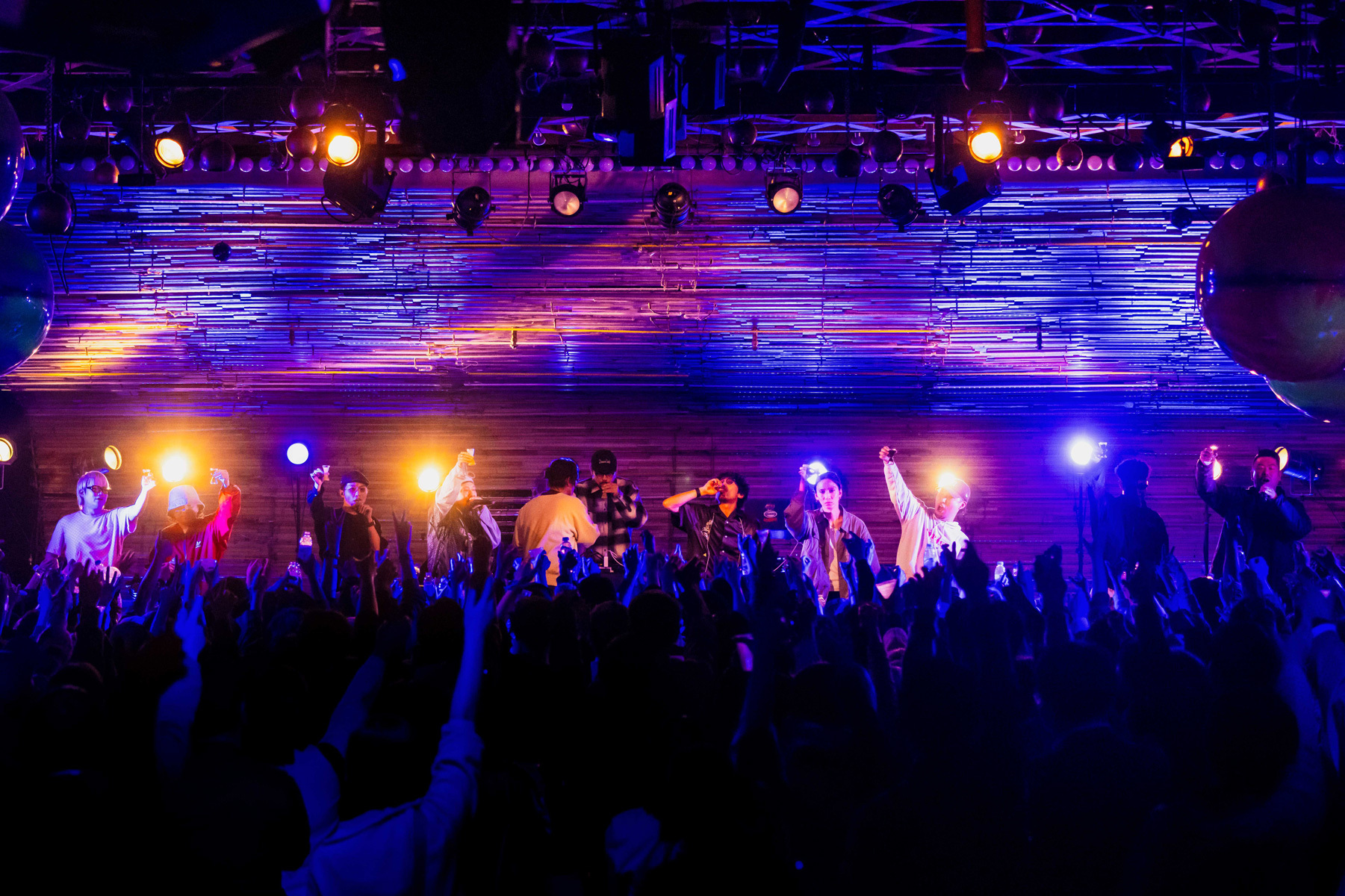梅田サイファーに助走や準備は必要なし。いざ鉄板の「梅田ナイトフィーバー’19」が始まるや、すぐさまピークへと駆け上がった最強クルーは、見渡す限りがハンズアップする光景をいとも簡単に生み出し味園ユニバースを完全包囲。SMAPの名曲『SHAKE』をマッシュアップする粋な計らいでも楽しませ、大阪ミナミの魔窟でうごめく獣のように、息つく暇もなく「YDK」~「スイッチ」と畳み掛けていく。