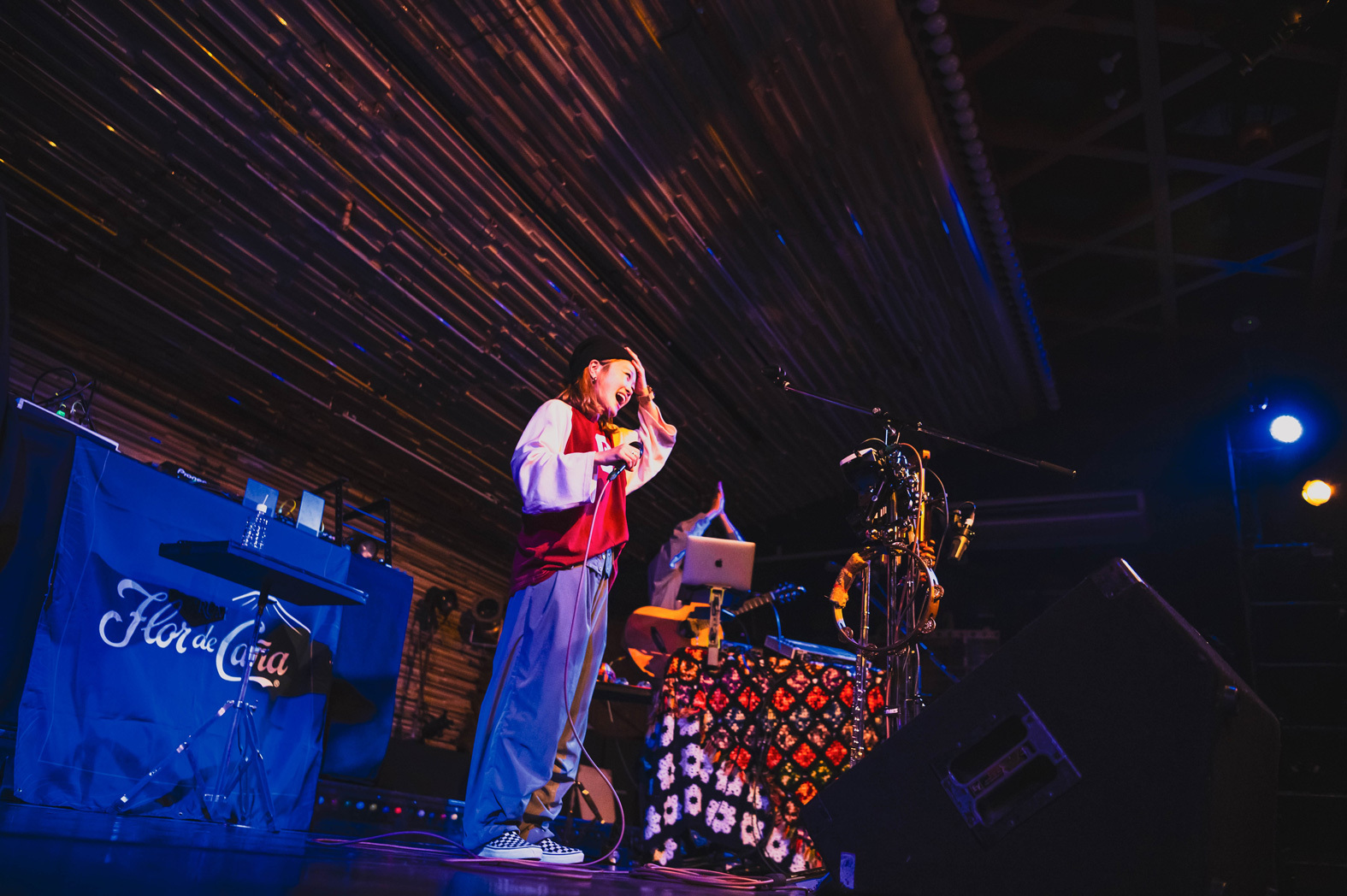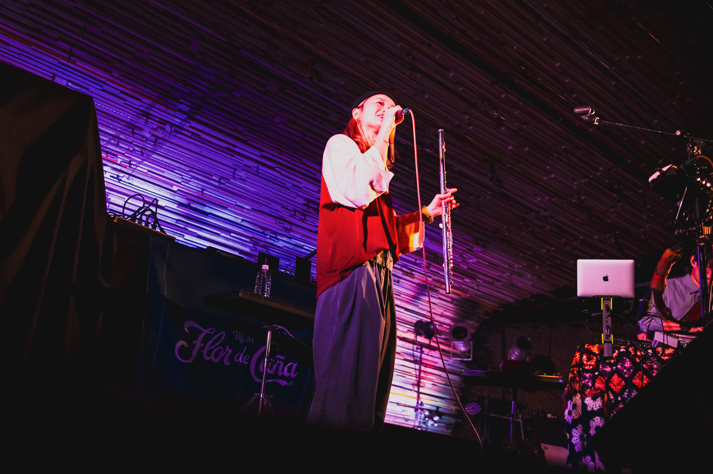 続く「メジャーデビュー」でも、高ぶるアコースティックギターのリフレインと歌声のみでグサグサ心臓を貫かれ、抑え切れない感動が何度も込み上げてくる。そんなラッパーNakamuraEmiのすごみに鼓舞されたかと思えば、とろけるように美しい「雪模様」では、シンガーNakamuraEmiの真髄に優しく包まれる。圧倒されることがこんなにも心地良いのは彼女のライブならではの体験で、「自分を変えたくて作った曲」という転機の「Rebirth」では、カワムラヒロシがMPC、NakamuraEmiがフルートでも楽曲を彩っていく。