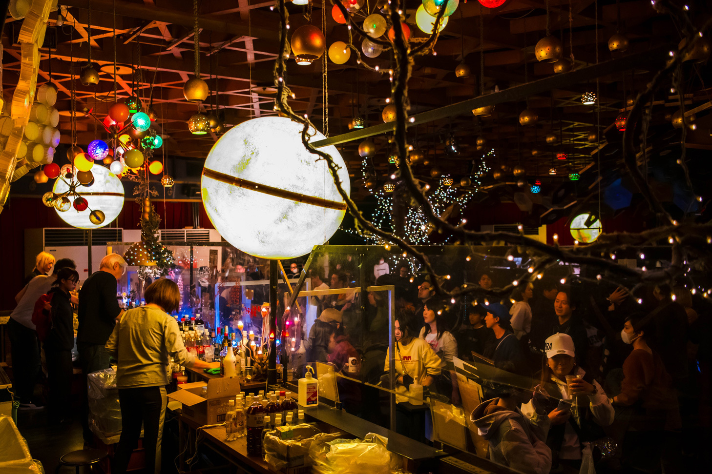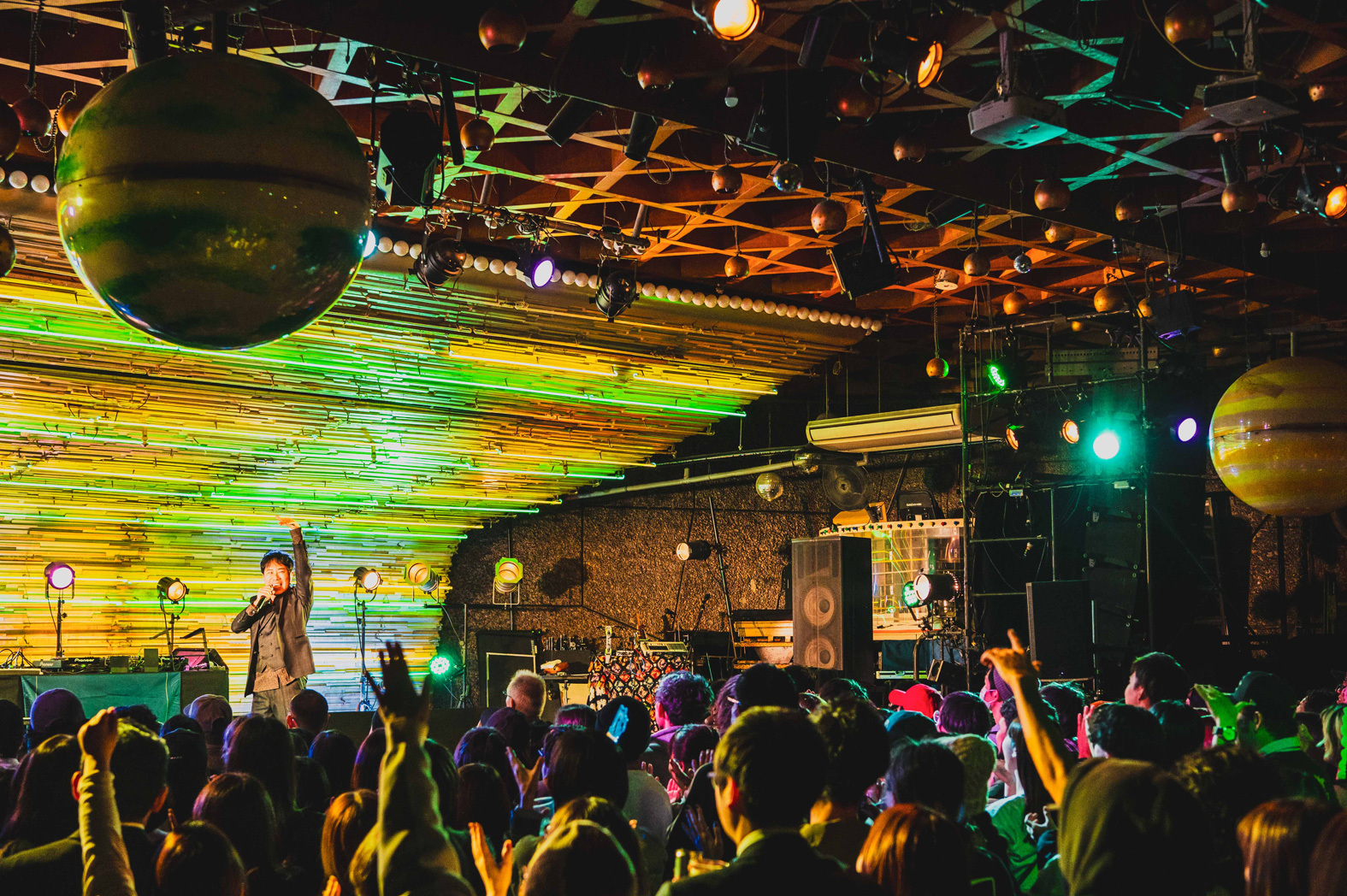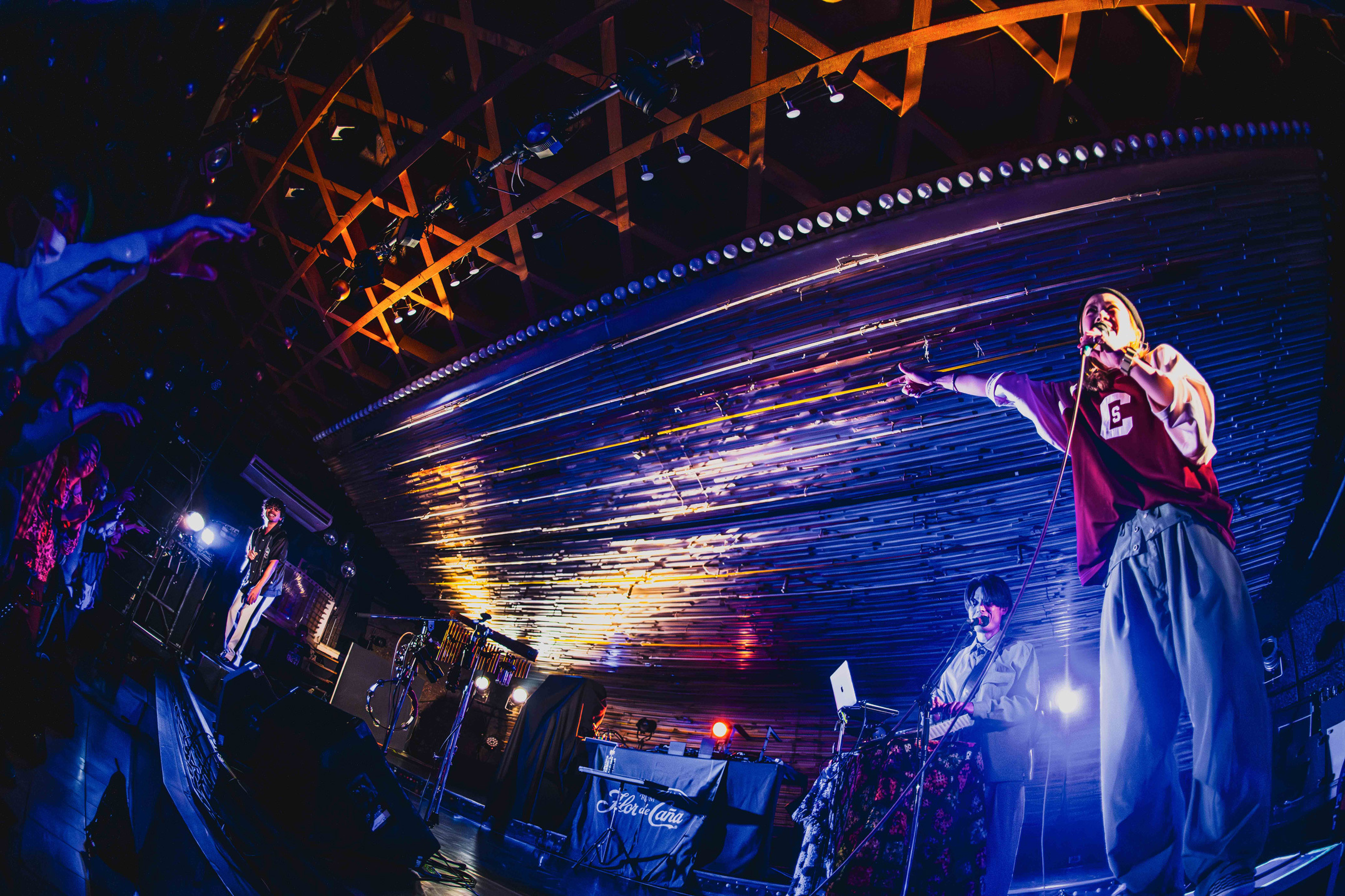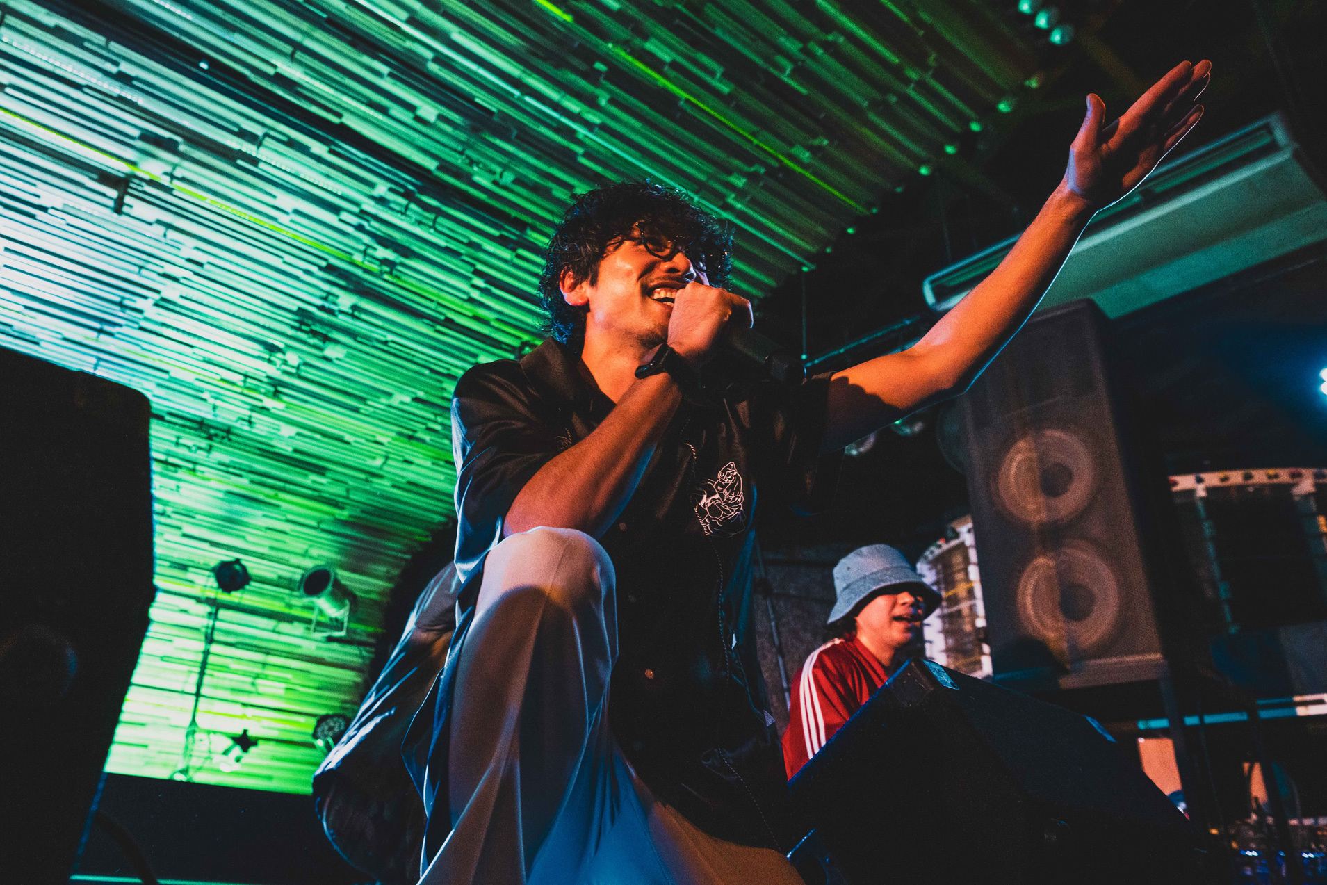 インターバルで「楽しんでるか『SHAKE』パーティーピーポー! 余力を残さないぐらいガンガン踊っていってくれますか!?」とテークエムがアジテートすれば、「いろんなジャンルの演者さんをこのフロアに呼んで……味園ってめちゃくちゃいい空間で、大阪の文化が交わる、お酒も人も音楽も混ざり合う場所やから『SHAKE』が始まったんです」とKZがイベントの主旨を説明。そして、「ってことですから、2曲続けてお酒に縁のある曲を」と再びテークエムがいざない、祭ばやしからオートチューンまでジャンルレスに横断した「iya-saka-zuki」~「Glass」の2連発! 代わる代わるメインボーカルがスイッチする層の厚さで、酒と音楽とに酔いしれるチルタイムを演出する。