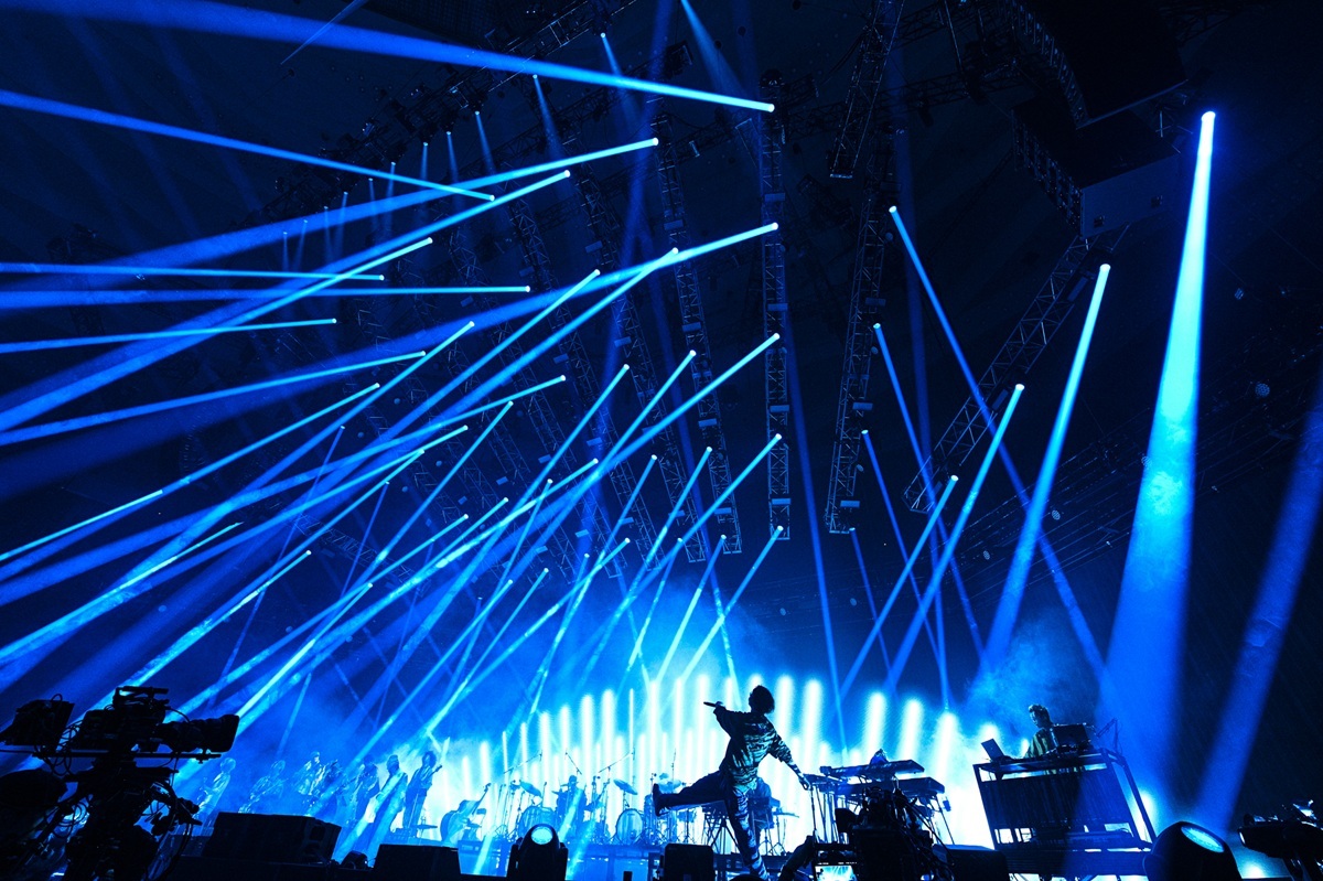 会場に入ると、横に異常にワイドなステージと12人分のおびただしい楽器やアンプに“本当に12人同時に演奏するんだ”という現実が押し寄せる。クアトロギター、トリプルベース、マニピュレーター、ツインキーボード、ツインドラムがインストでセッションし、背景のワイドLEDには太陽フレアが燃え盛り、スモークも焚かれたSF的な演出を伴い鳴らされた1曲目は、まさにここに降り立った感が際立つ「TOKYO」。ちょっと呆気に取られるスケール感ですかさず「Stop Us Dreaming」へ。JQは広いステージの端から端までオーディエンスとコミュニケーションをとるように歩く、歩く。また、総勢13名のアンサンブルを濁らせず抜群のバランスで出力するPAにも驚かされる。揺れる炎の背景が映し出され、イントロが鳴らされると大きな歓声が上がり長く愛される「NEW ERA」のカラッとしたメロディにクラップもどんどん大きくなり、エレピのソロに拍手が湧き起こる。この日、たびたびメンバーのソロがフィーチャーされ、その度に大きな声援と拍手が起きたのだが、その見せ方もリアクションもまさにバンドならではのダイナミックな見せ場だったのだ。