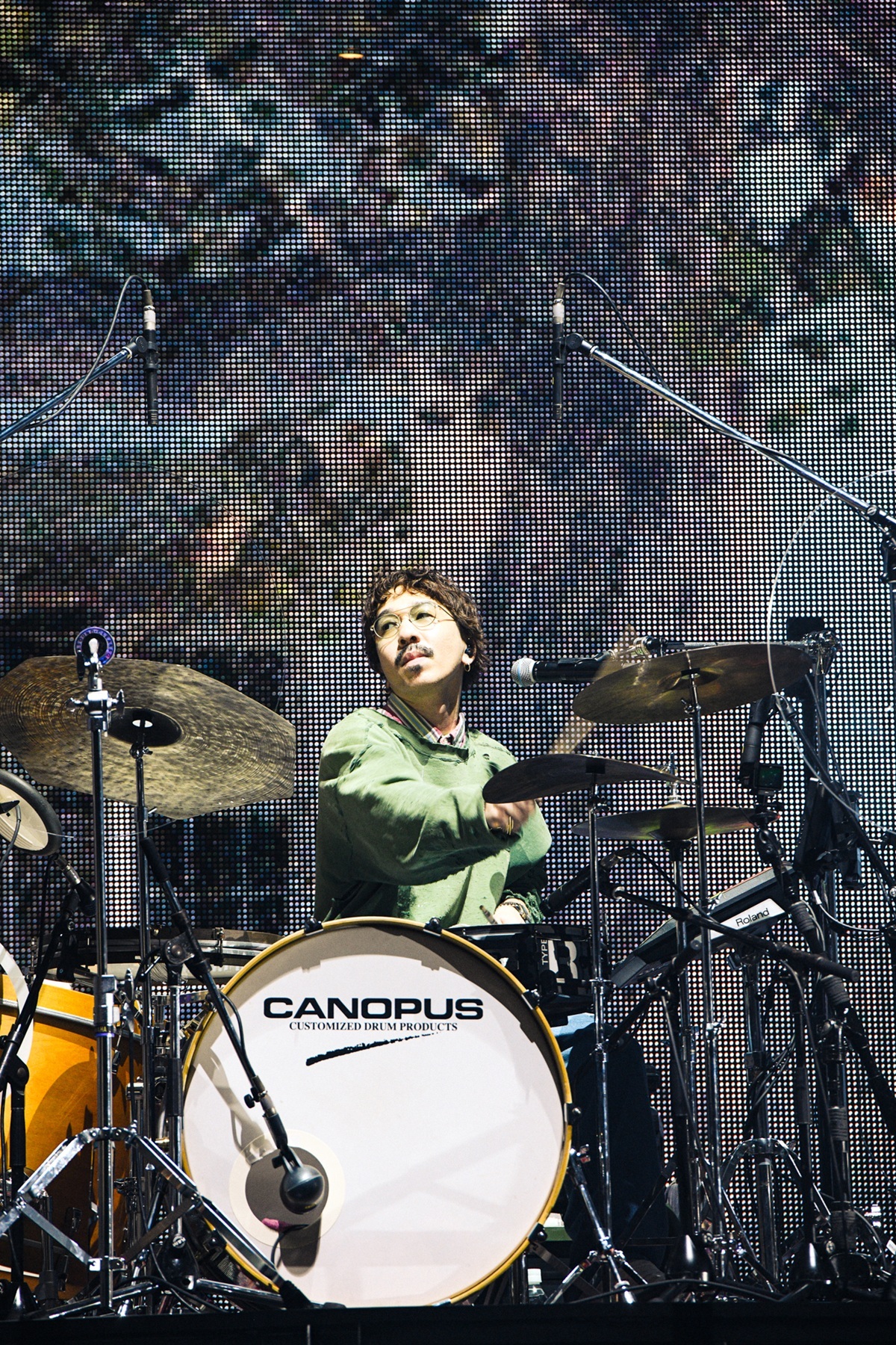 渋めのギターのオブリに乗って煙に見立てたスモークが滑り込む「Cigarette Butt」は演奏も相まってフィルムノワールな雰囲気。そしてアメリカのハイウェイ沿いのレストランがそこにあるような映像演出はワイドな背景を活かし切って見事。このバンドの十八番と言えるレイドバックしたビートの「Spread Butter On My Bread」のノリに最高に合う。ギター、ベースとソロプレイもふんだんに盛り込み、演奏と音に酔う。1曲ごとに映画のシーン並みの情報量と豊穣なアンサンブルが到来し、体を揺らしながらそれらを全身で浴びる体験は実に贅沢だ。JQがドラムをプレイしながらの「JUICE」は心なしかスネアのボリュームがアップしている。小編成のライブではドラム&ボーカルも披露するJQだが、武道館でまさか見られるとは!と、オーディエンスの歓声もひときわ大きくなる。さらに「In Your Pocket」ではバンドのグルーヴにも厚みが出てきた。そこへ馴染みのSEが放たれるとひときわ大きな拍手が起き、グッとタフなライブアレンジになった「Super Sonic」に合わせて誰もが自由に体を動かす。ジャジーなピアノソロに会場中がエネルギーを送るような熱が生まれていた。