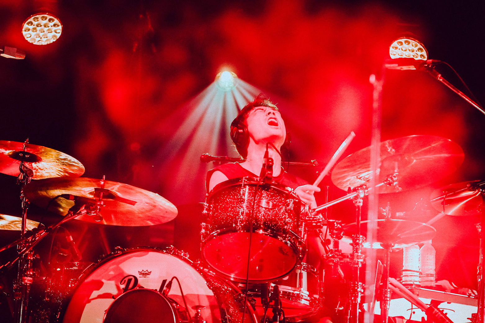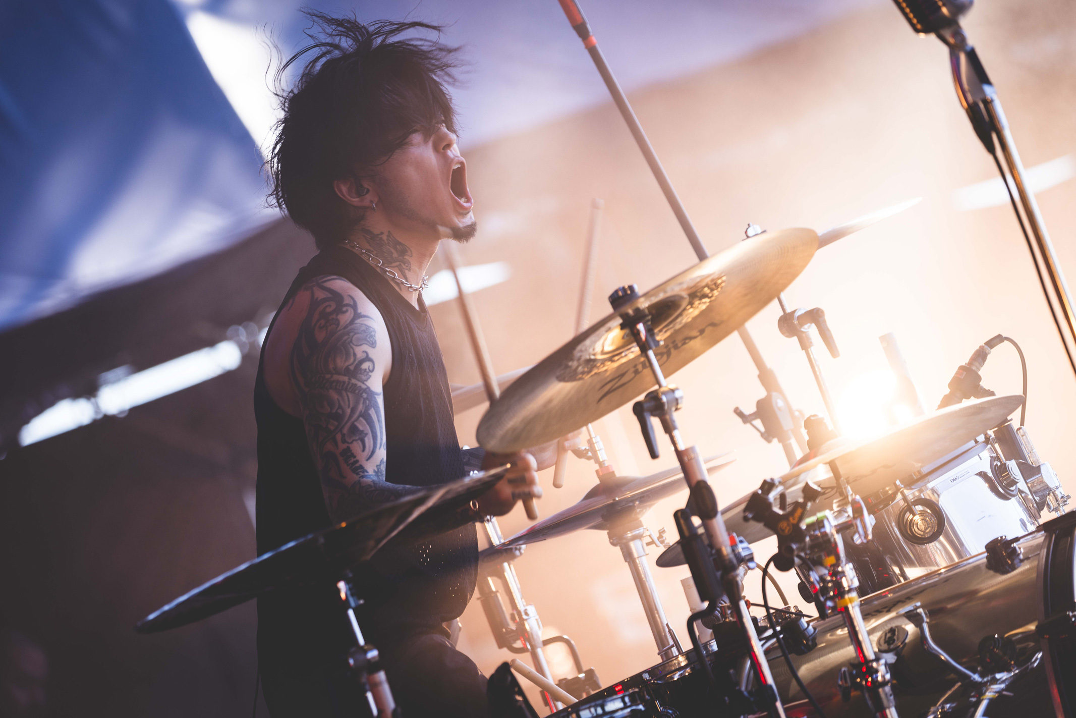 その後もほとんどノンストップで、しっかりと聴かせながらも躍らせる濃厚なナンバーを連発し、一体感と躍動感を増していく。1曲目から出現していたサークルだが、「ALONE」ではその規模が増大! いてもたってもいられないとばかりに、どんどん人が加わっていく。そんなフロアの熱量を見てHiroは「来れるとこまで来い! 受け取ってやるよー!」と叫び、畳み掛けるようにラストチューン「不可逆リプレイス」へ。サビでKid’z(Dr)のドラムセットの台に乗ったHiro、Nob(Ba)、Teru(Gt)が後ろ向きにジャンプする演出も、定番ながらカッコ良い。何度も観客と距離を近付け、咆哮し、全身全霊の演奏を見せた4人。最後は音楽と花火の競演で最高のクライマックスを迎えた。Hiroはやりきったとばかりに、地声で「ありがとうございましたー!」と気持ち良さそうに叫んで深々とお辞儀。メンバーも満足そうな顔でステージを後にした。