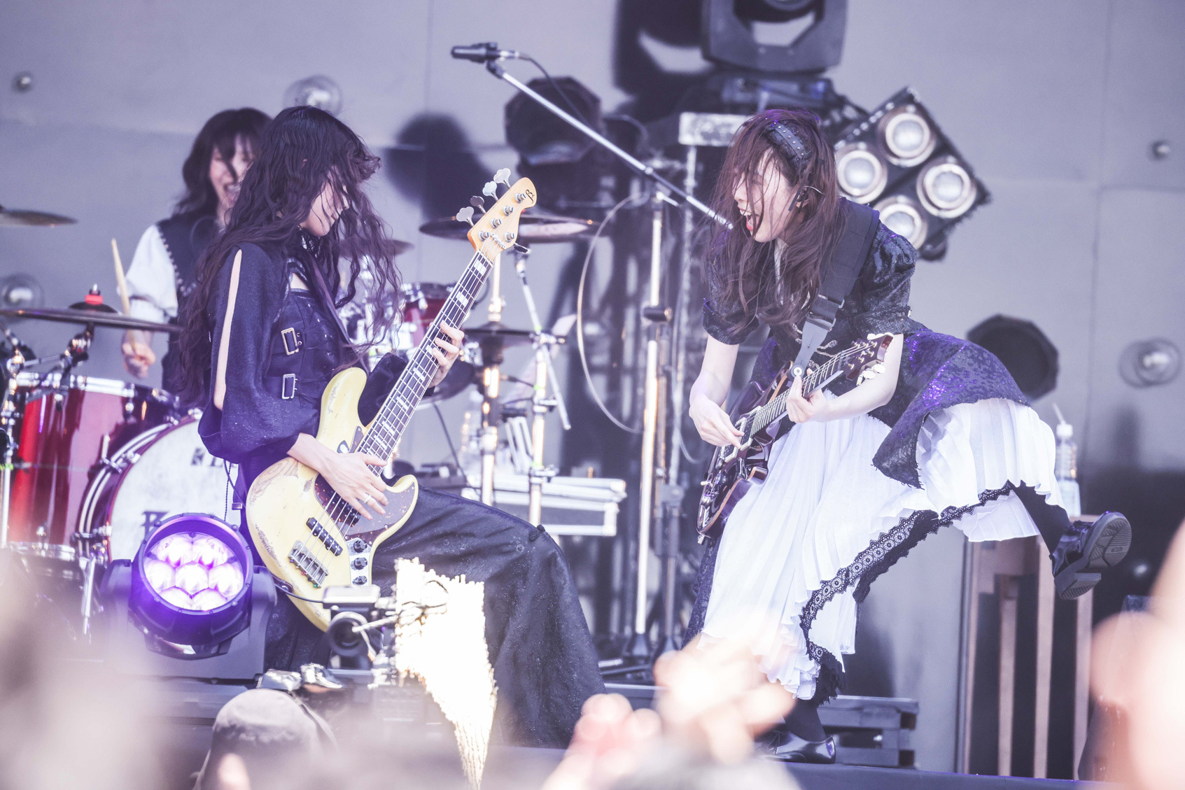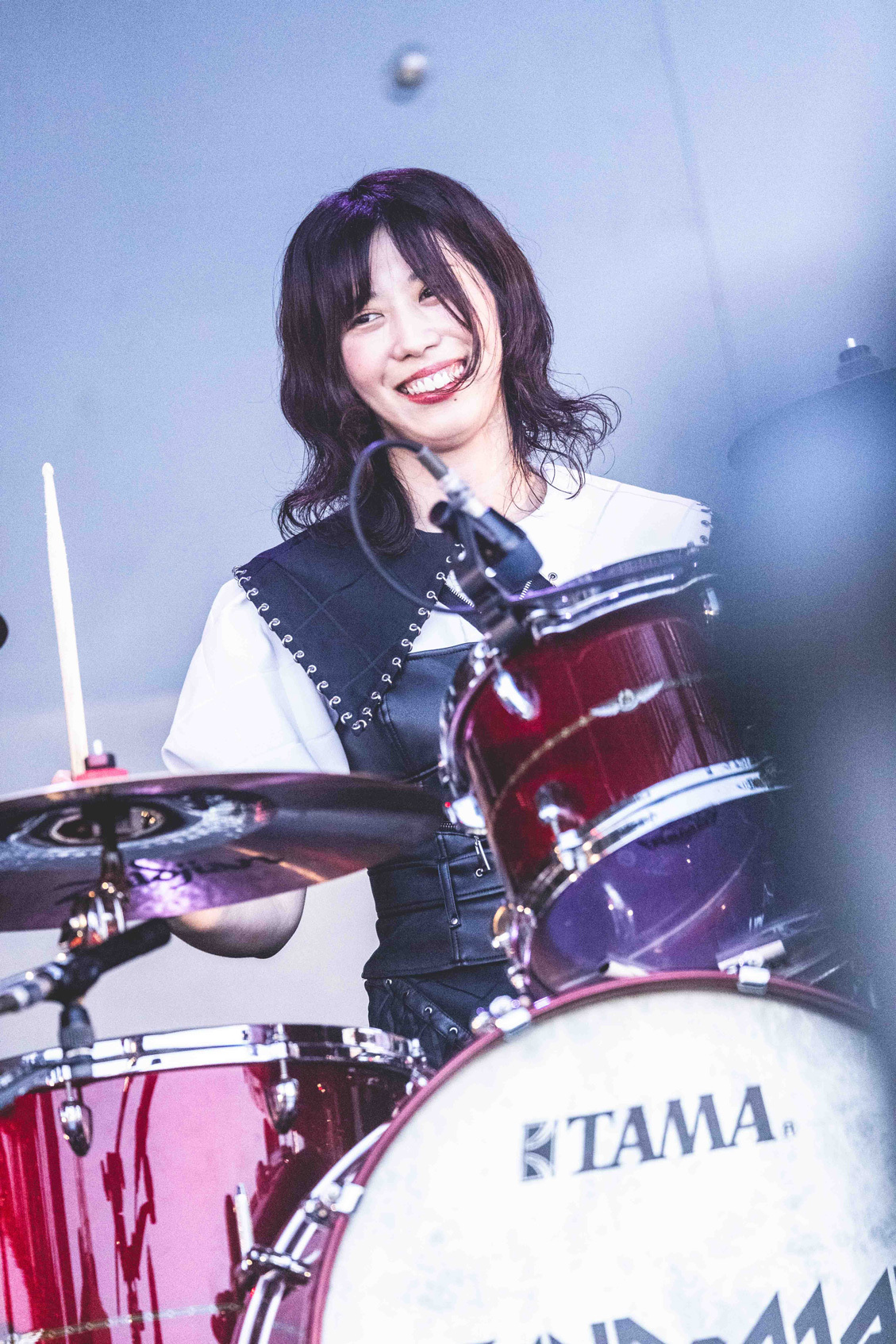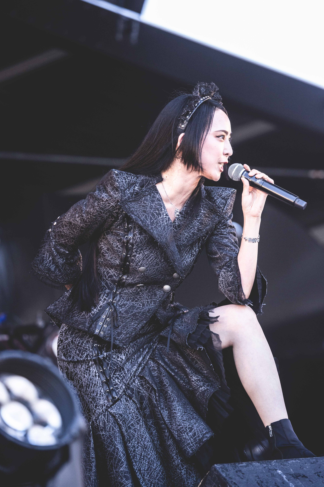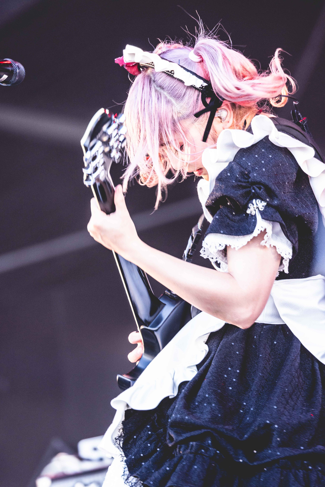 ステージを縦横無尽に動き回る彼女たちのエネルギッシュなパワーは、ダークな世界観の中にありながらも、どこか爽快感を感じられた。小鳩の「ようこそジャイガへー! 最高の夏フェスにするっぽー!」という明るいMCを経て、さらに勢いを増したお給仕後半、KANAMI (Gt)とMISA (Ba)のテクと実力の高さを存分に発揮したエモーショナルなセッションが最高の見せ場を作り上げた「Influencer-solo-」に続き、ラストは9月にリリースされたフルアルバム『Epic Narratives』収録の「Magie」でフロアを踊らせまくり、大熱狂の渦に包み込んだ。