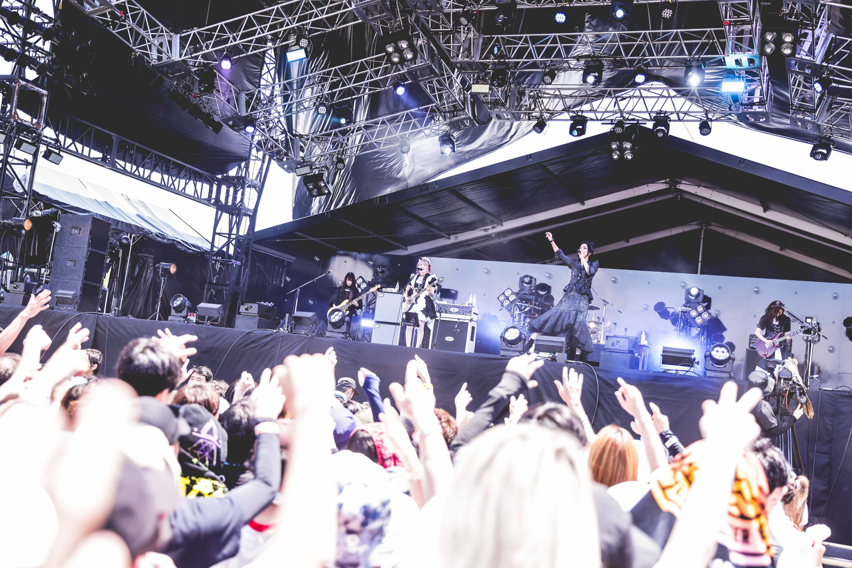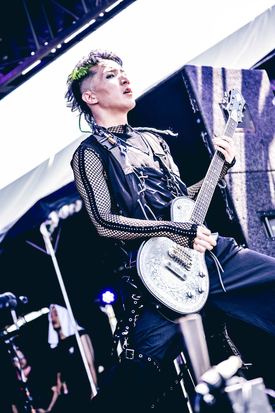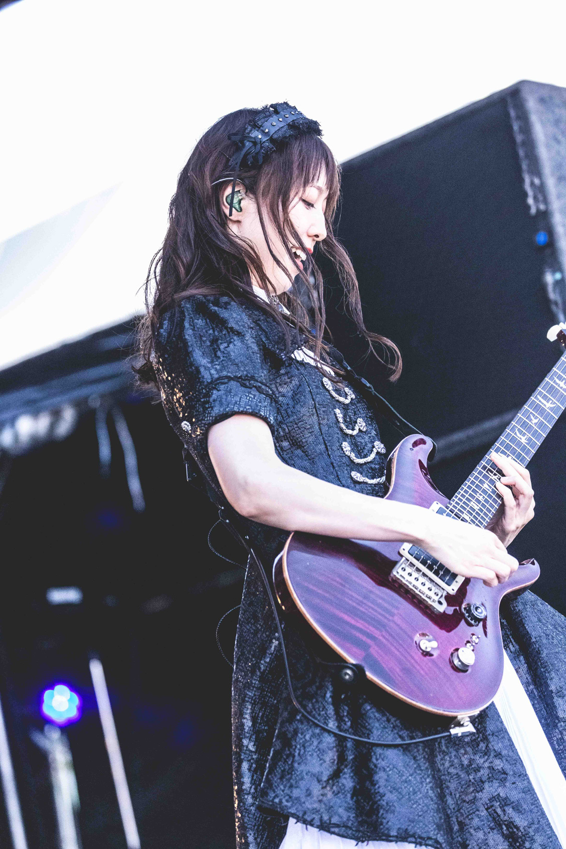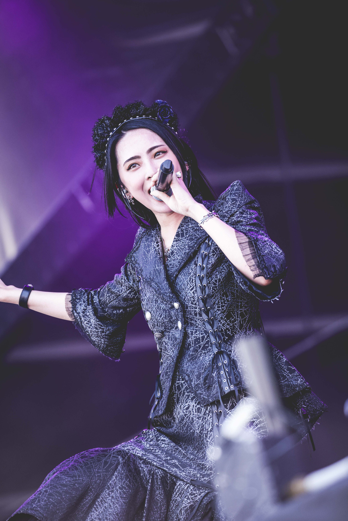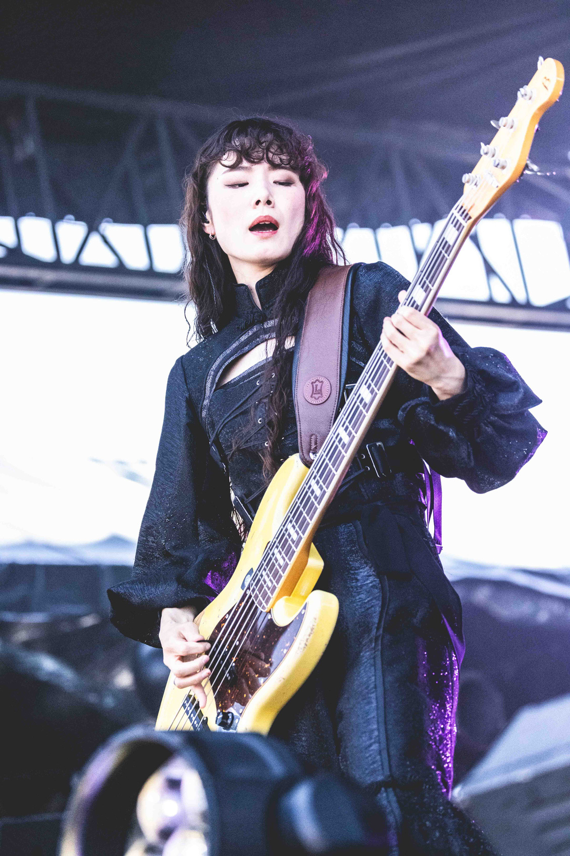 ステージを縦横無尽に動き回る彼女たちのエネルギッシュなパワーは、ダークな世界観の中にありながらも、どこか爽快感を感じられた。小鳩の「ようこそジャイガへー! 最高の夏フェスにするっぽー!」という明るいMCを経て、さらに勢いを増したお給仕後半、KANAMI (Gt)とMISA (Ba)のテクと実力の高さを存分に発揮したエモーショナルなセッションが最高の見せ場を作り上げた「Influencer-solo-」に続き、ラストは9月にリリースされたフルアルバム『Epic Narratives』収録の「Magie」でフロアを踊らせまくり、大熱狂の渦に包み込んだ。
