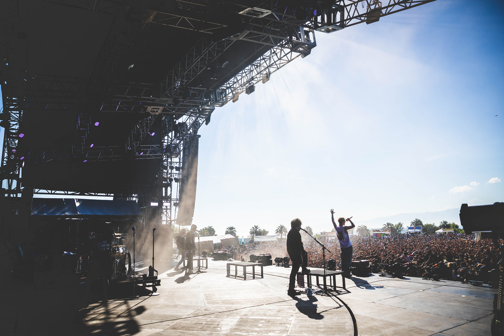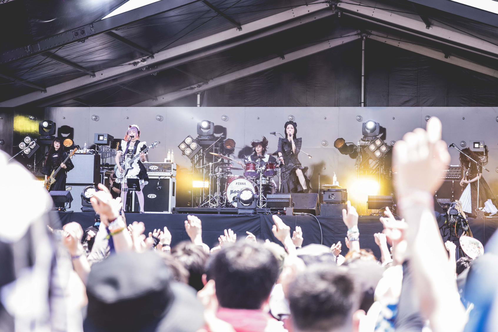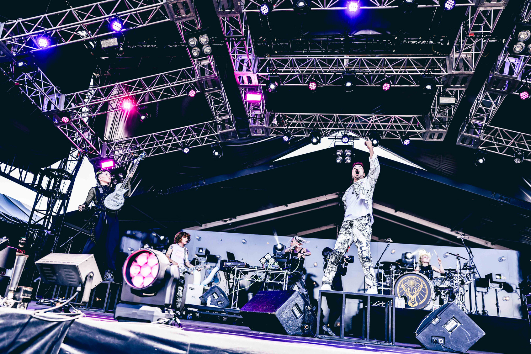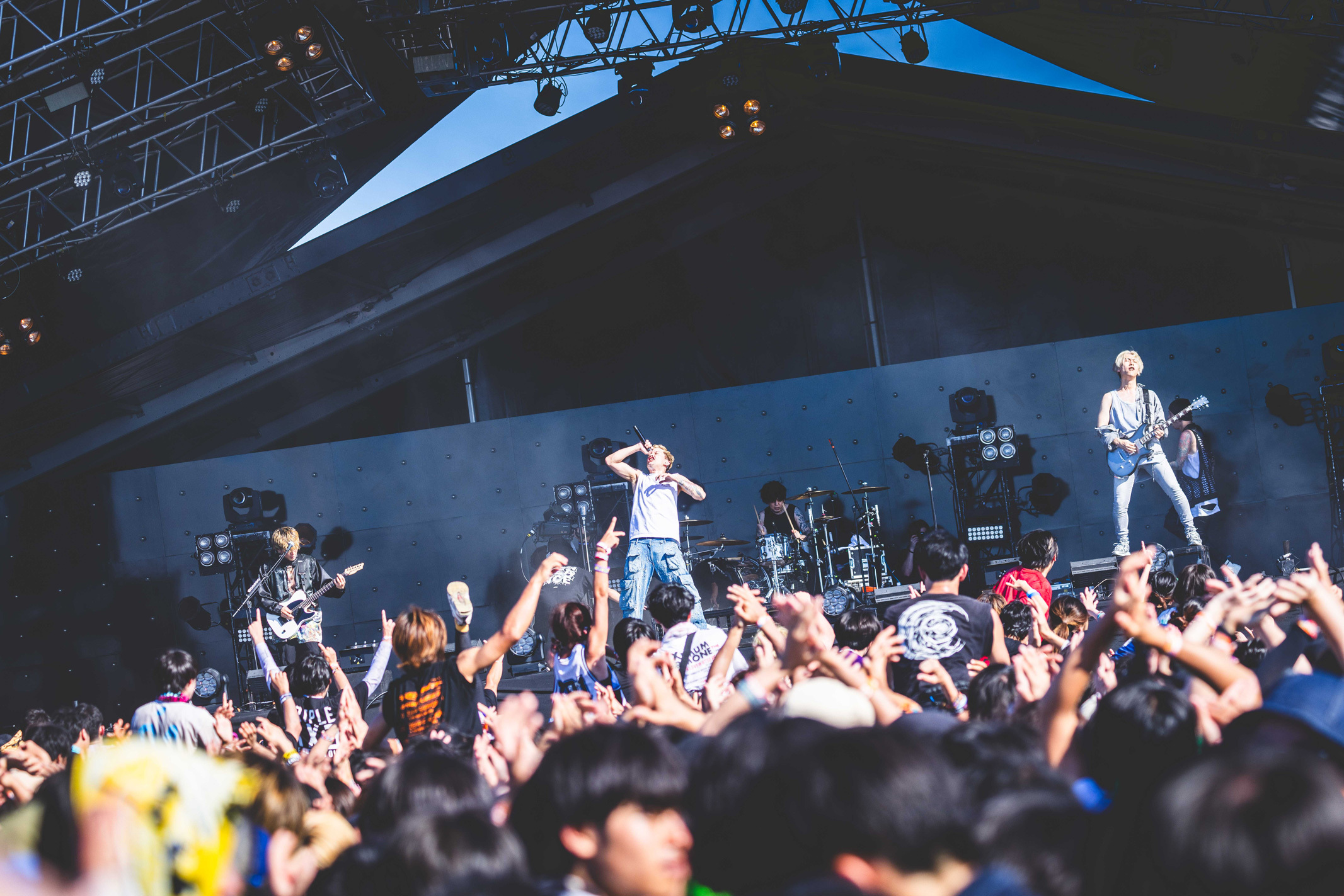 昨年、最大キャパのSKY STAGEの大トリを飾ったFear, and Loathing in Las Vegasは、真昼のステージでも痺れるカッコ良さで数万人をひとつにした。SEが流れ、元気にステージに飛び出したSo(Vo)、Minami(Vo.Key)、Taiki(Gt.Cho.Vo)、Tomonori(Dr)、Tetsuya(Ba.Cho.Vo)は、のっけから爆音で「Acceleration」を投下、華麗に揃ったクラップでフロアを導いていく。ビジョンに上空からのドローン映像が映し出されると、盛り上がってうごめく観客の規模に度肝を抜かれる。Minamiは2曲目の「Rave-up Tonight」で早くも客席へ飛び降り、そこをめがけて発生したリフトとダイバー、サークルモッシュですさまじい一体感を生み出した。