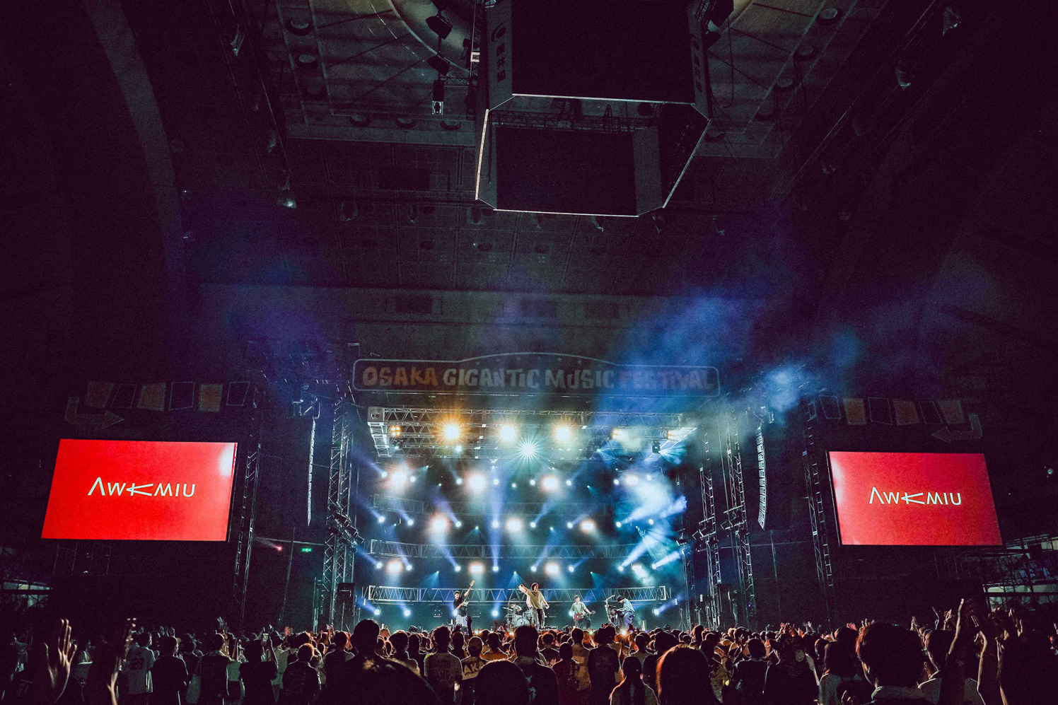 『ジャイガ』2日目の幕を切ったのは、SKY ARENA STAGEにO.Aとして登場した4人組バンド・Awkmiu(オークミュー)。Aki(Key)がゆったり鍵盤ソロを奏でると、やがてブルーの照明が下から上へ走り抜け、同時に勢いよくカヤケンコウ(Ba)と関根米哉(Dr)もジョイン。シキ(Vo)が登場して「どくどく」をポップかつキャッチーにプレイした。中性的で透明感のあるシキの歌声と、誠実な雰囲気を感じる楽器隊の演奏に、早速フロアは手を挙げて応える。シキは「初めて出演させていただきます。フェス自体に出るのがまだ2回目で、パワフルな1日のオープニングを任せていただいて、内心震えながら大阪に来たんですけど、素敵な1日の幕開けになるよう心を込めて演奏するので、好きなように楽しんで帰ってください!」と挨拶し、ラストのロックチューン「灯火」まで、全5曲を全力で駆け抜けた。