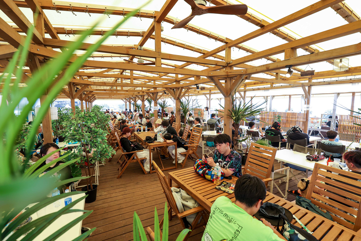 海沿いにあるSUN AREAには、今年も冷房、シャワー、トイレ、ベッド完備のプライベート休憩所「ジャイガハウス」が登場。「VIP HOUSE」はハウス内からSUN&COAST STAGEのライブやオーシャンビューを鑑賞することができる、スペシャルな内容。「VIP HOUSE」も専用テラスがあり、気心知れた仲間とフェスを楽しむのにもってこいだ。「プレミアムラウンジ」には、屋根付きのラウンジにリクライニングチェア、扇風機、観葉植物などが置かれ、さながら南国リゾートのよう。涼みながらSUN&COAST STAGEの様子も見ることができた。
