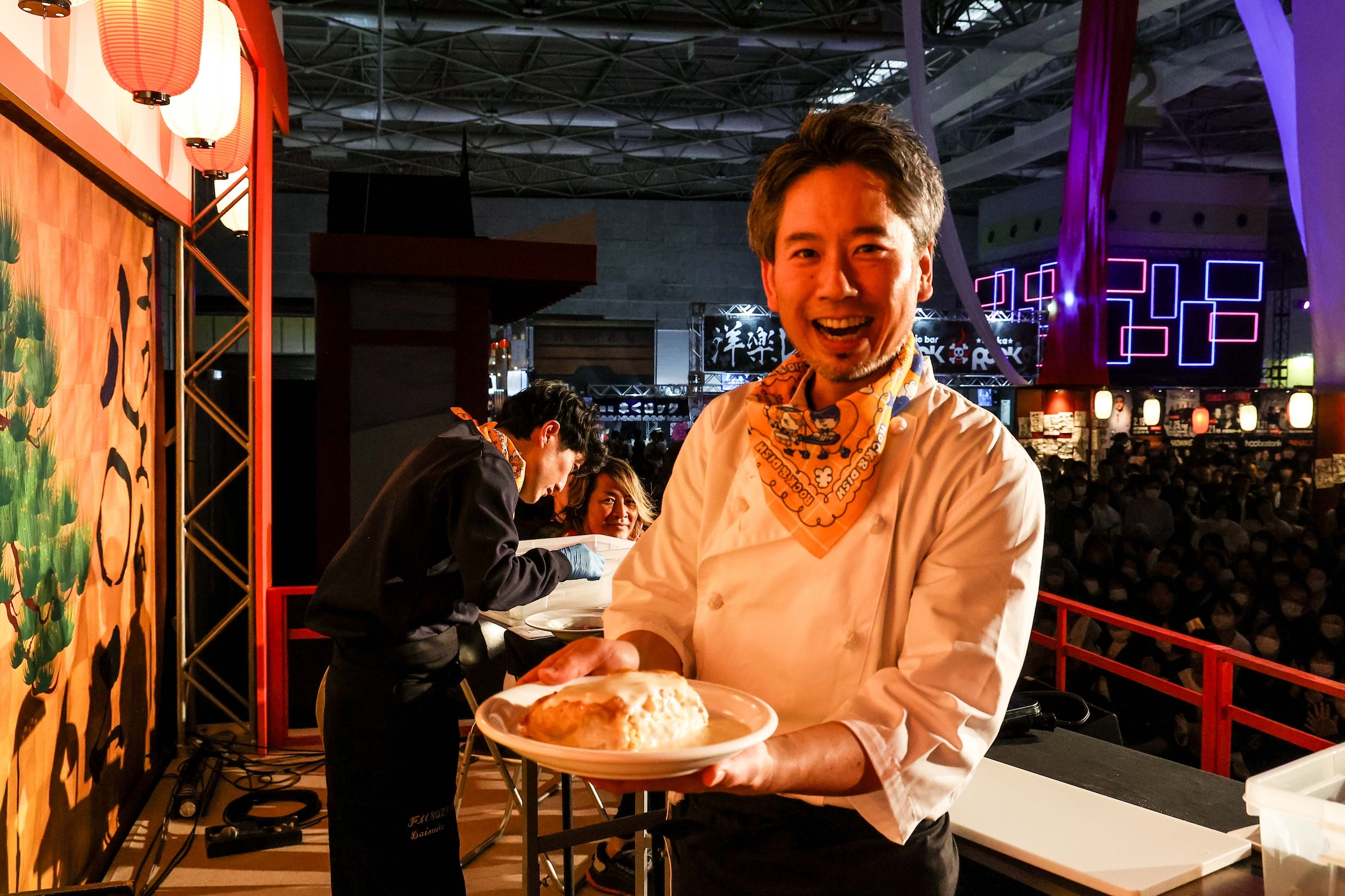 低温コンベクションオーブンでじっくりと焼きあげ、最後に高温で皮をパリッと仕上げた、伊地知の「パリパリチキンライス・チーズソース」。棚橋選手が頬張りながら「おいしい! チキンなのでタンパク質がとれる!」と感嘆の雄叫び。チキンの皮と身の間に、チキンライスを詰め込むアイディアに佐藤&小倉も絶賛していた。